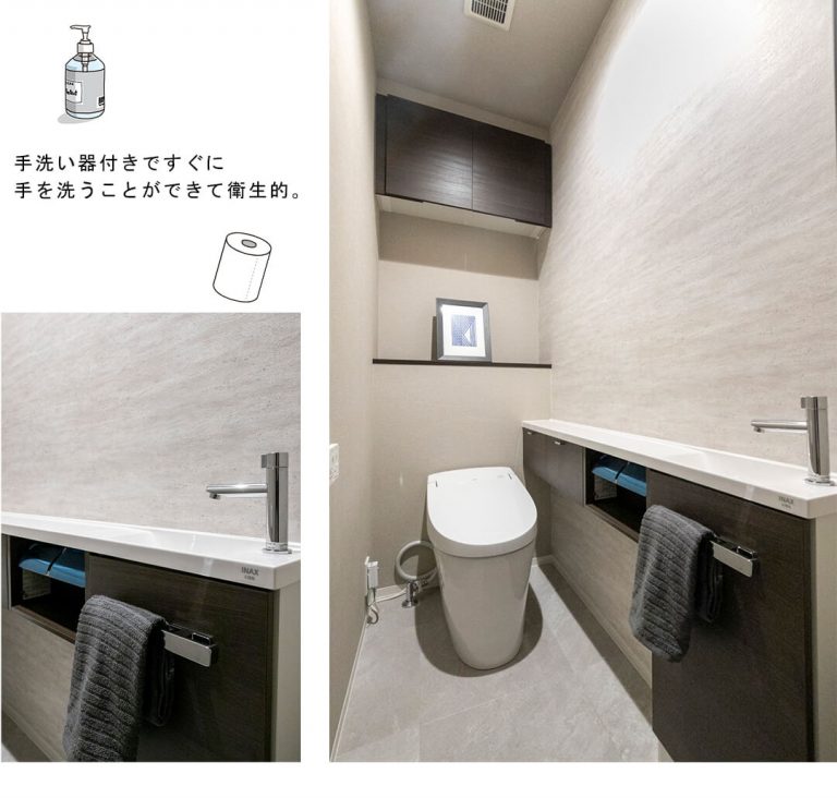 ウォシュレット一体型のトイレです。タンクレスタイプなのでお手入れもしやすく、別途で手洗い器が付いているのですぐに手を洗うことができて衛生的。上部には吊戸棚が設置されているので、トイレットペーパーなどを収納することができます。カウンタースペースには小物やアロマなどを飾ることもできますよ。
