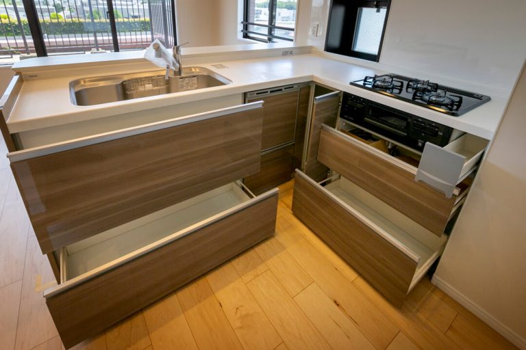 3口コンロ、グリル、食洗機付きと設備面も充実しています。シンクも広々としているので野菜などが洗いやすそうですよ。