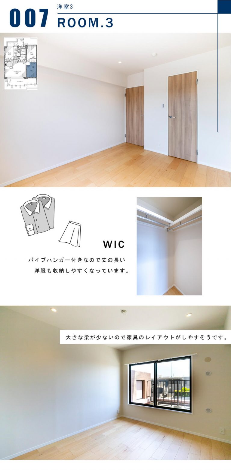約6.3帖の洋室3にもウォークインクローゼットが付いています。パイプハンガー付きなので、ワンピースやコートなどの丈の長い洋服も収納しやすくなっています。また、お部屋にはマンション特有の大きな梁が少ないので、家具のレイアウトがしやすそうです。