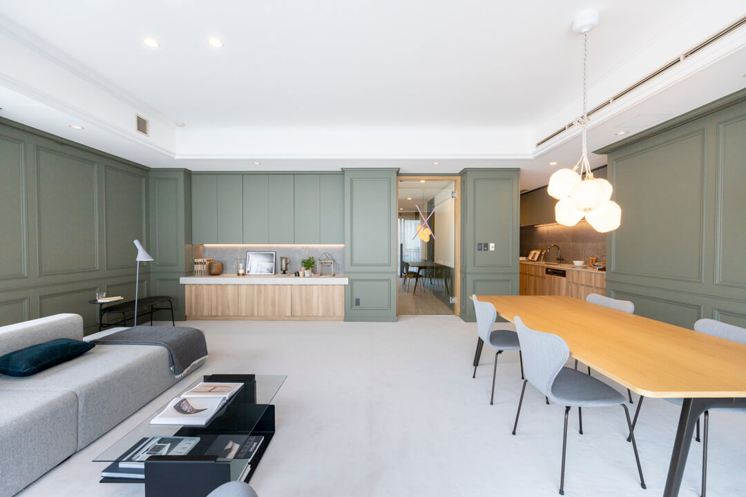 約21.4帖のゆったりとしたリビングダイニング。南東側に窓が並び、明るく開放的な空間です。北東側にも窓があるので風が通り、自然換気がしやすいですよ。壁全体が淡い木目調になっていて、デザイン性の高さが魅力的。飾るインテリアを気軽に楽しめるピクチャーレール付きです。さらに、間接照明付きのアクセントウォールが洗練された雰囲気を演出してくれます。