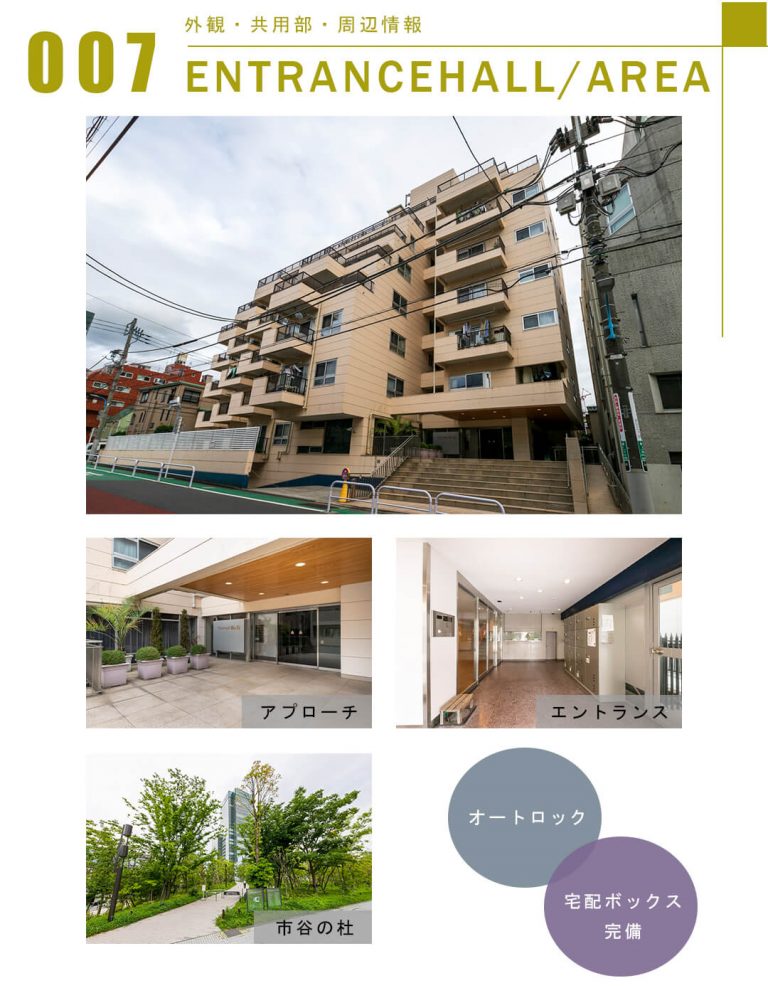 マンション市ヶ谷は、1968年(昭和43年)3月竣工、総戸数74戸、鉄骨鉄筋コンクリート造、9階建てのヴィンテージマンションです。ベージュで優しい印象の外観に手入れの行き届いたエントランスが特徴的。オートロック、モニター付きインターホンなのでセキュリティ面は安心です。さらに、宅配ボックスが完備されているので、忙しい方でも時間を気にせずに荷物を受け取ることができます。また、本マンションは、都営大江戸線「牛込柳町」駅から徒歩6分、都営新宿線「曙橋」駅から徒歩9分との2つの駅が利用可能な交通アクセスの良い立地にあります。ビッグターミナルである「新宿」駅まで乗り換えなしで行くことができるのも通勤通学に便利で◎。