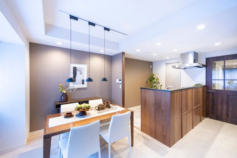 約15.6帖の広々としたリビングダイニングキッチンは、南向きのため陽当たりが良好です。壁面にはグレーのアクセントクロスがあしらわれていてお部屋を上品な雰囲気に演出してくれています。絵画なども飾りやすくなっていて◎。