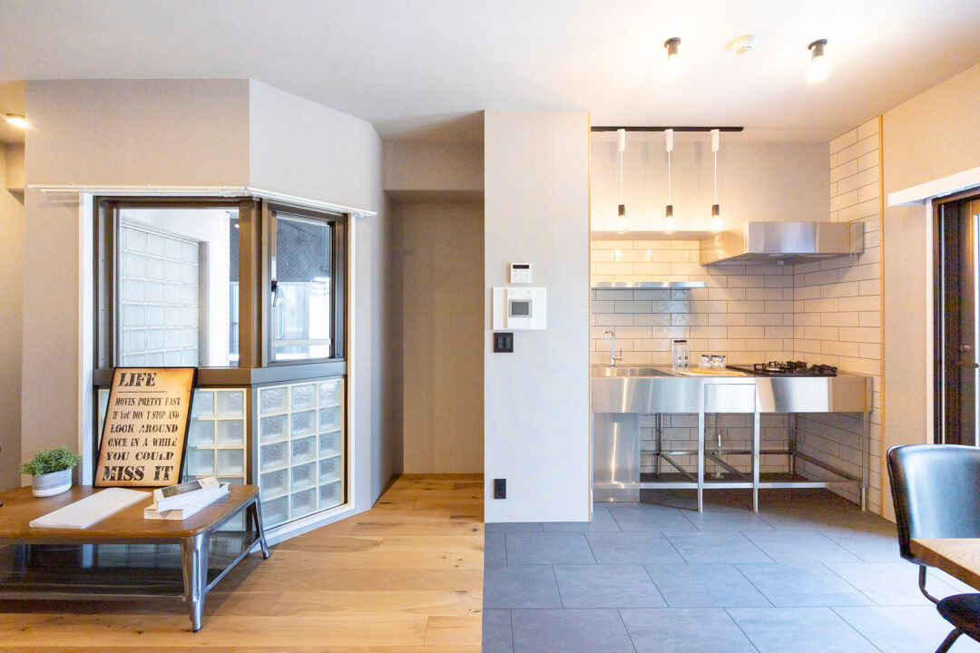 リビングダイニングは、落ち着いたインダストリアルな雰囲気。床材はリビングスペースとダイニングスペースで異なる質感の物を使うことで、さりげなく空間を分けてくれています。また、天井にはダクトレールが設置されているので、照明の付ける位置などにも幅が出ます。お気に入りの照明を付けてインテリアにもこだわりましょう。