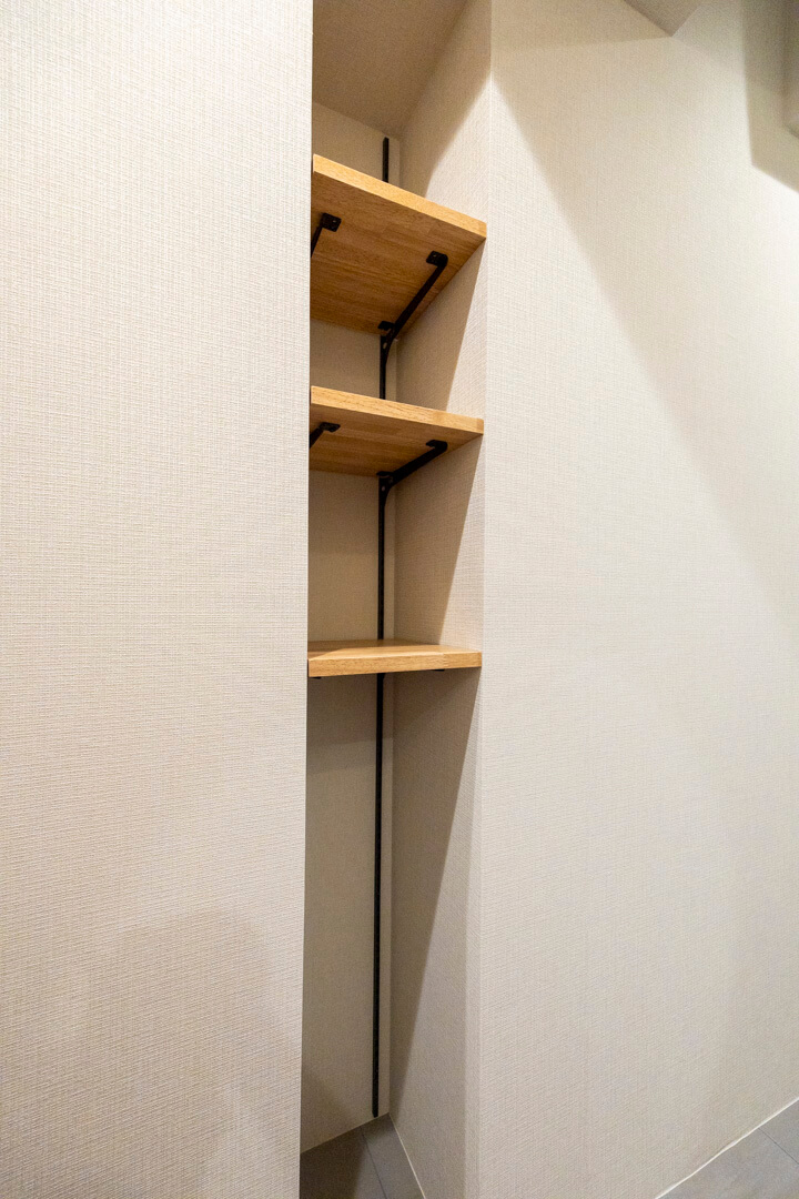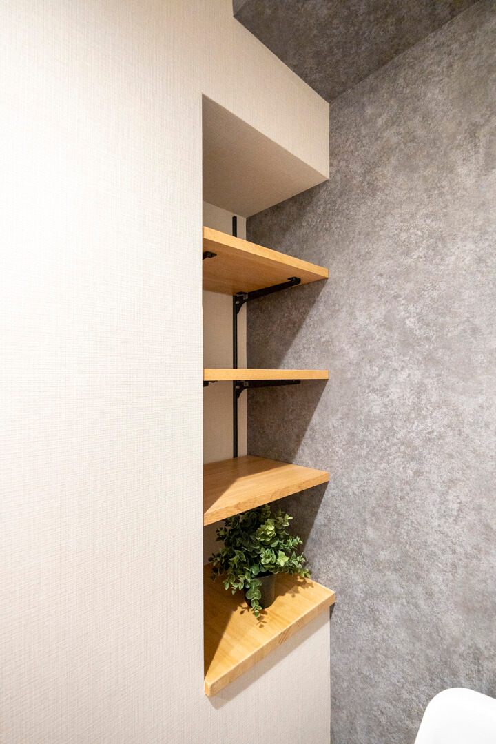 ウォシュレット一体型のトイレです。壁面には、可動棚が造られているので、小物やアロマを飾ることもできますよ。