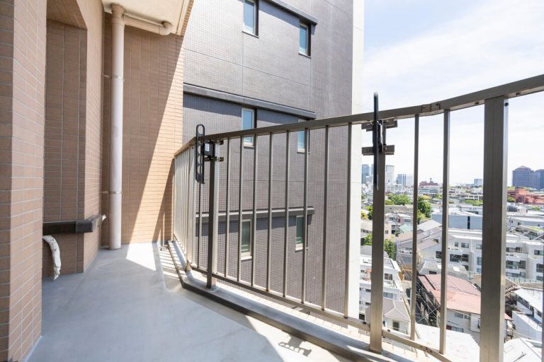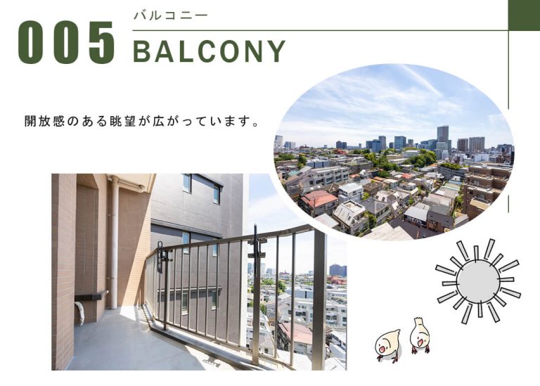 約6.45㎡のバルコニーは、南東向きで陽当たりが良好です。また、9階ということもあり眺望も良好。開放的な空間となっています。