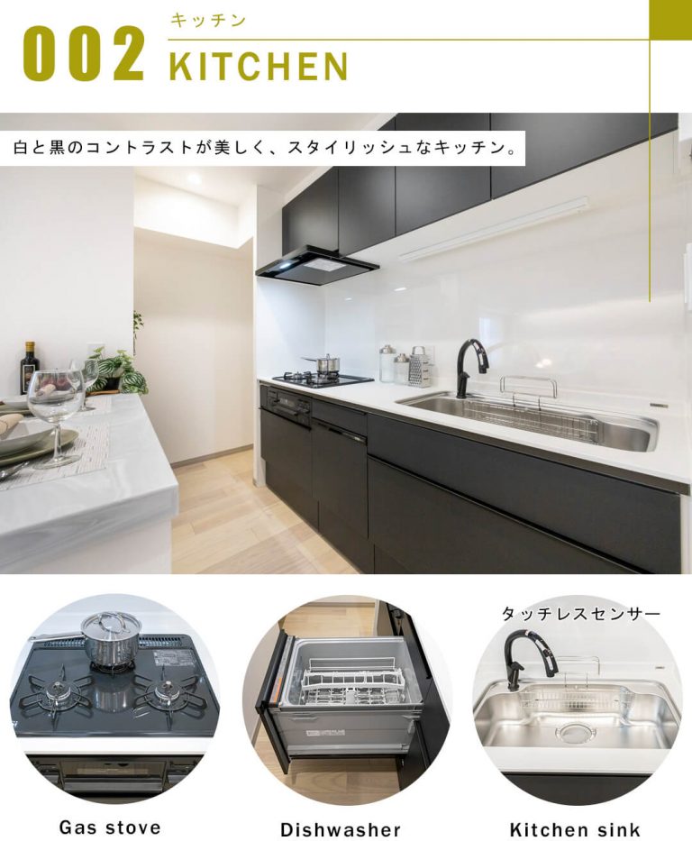 白と黒のコントラストが美しく、スタイリッシュなキッチン。調理に集中しやすい壁付タイプです。グリル付3口ガスコンロ・食洗機内蔵で設備が充実しています。水栓はタッチレス仕様なので手が汚れていても使いやすく、節水効果が期待できますよ。