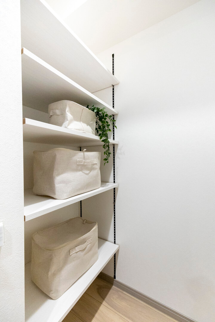 キッチン右手に開き戸収納、左奥に可動棚があり、収納性に優れています。食料品のストックや食器、キッチン家電などを整理整頓でき、ごちゃごちゃしがちなキッチンまわりがすっきり片付きそうですね。冷蔵庫置き場が奥にあり、生活感をさりげなくカバーできるのも嬉しいです。