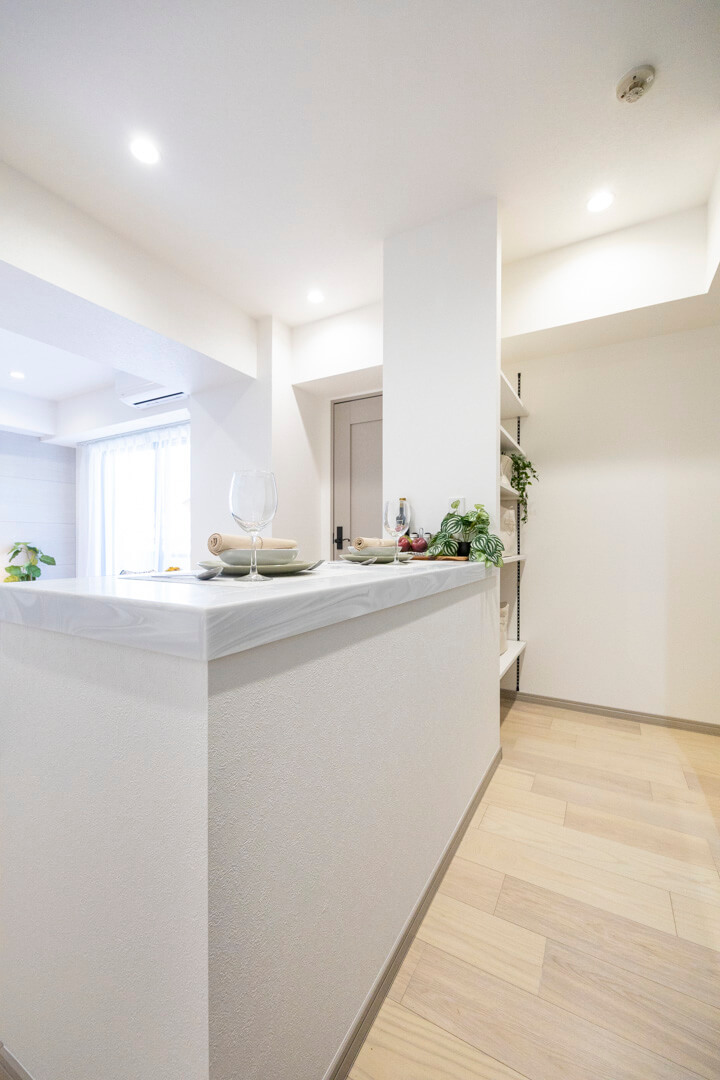 キッチン背面にはカウンターテーブルを備え付け。さっと食事をしたい時、料理しながらゲストをもてなしたい時などに便利です。複数人で調理するときの作業スペースとしても重宝しそうです。