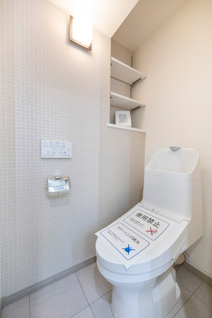 洗面室に接続するレストルーム。水まわりが1ヶ所にまとまっていて、便利な動線です。使用後にすぐ洗面台で手を洗えるのも嬉しいですね。TOTO製のウォシュレット付トイレに交換済み。奥には可動棚があり、トイレットペーパーを収納したり、小物を飾ることができます。