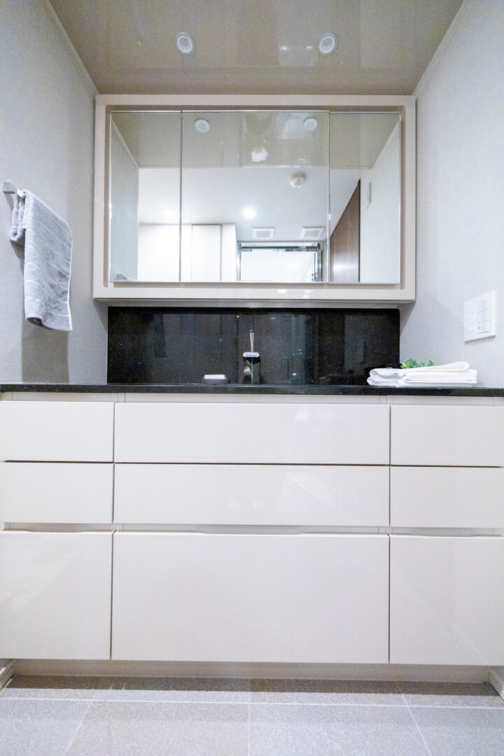 ダークトーンのカウンターでスタイリッシュな洗面化粧台です。サイドにスペースがあるのも朝の支度がしやすくて◎。また、三面鏡は中に化粧品などの小物が収納できるようになっているので使い勝手良好です。洗濯機置場の横には、扉付きの棚が造られていてリネン類や着替えなどを収納することもできます。
