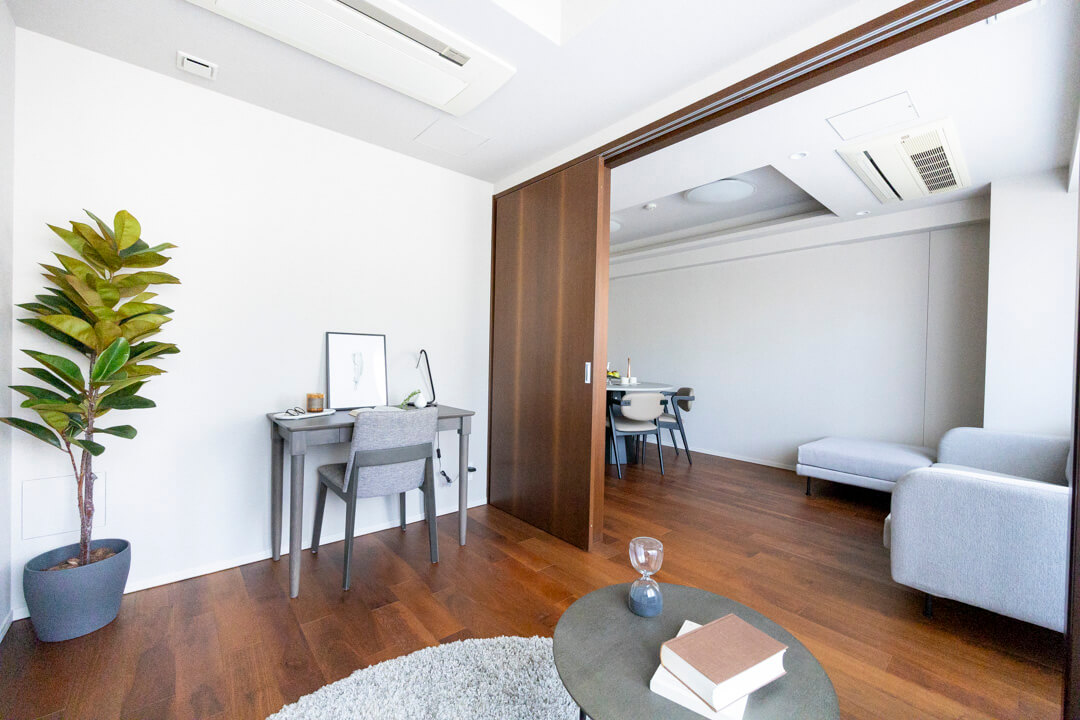 天井は折り上げ天井になっていて、空間に広がりを与えてくれています。さらに、間接照明があしらわれていて柔らかく上品な印象に。エアコンは埋め込み式のためお部屋の雰囲気を壊しません。