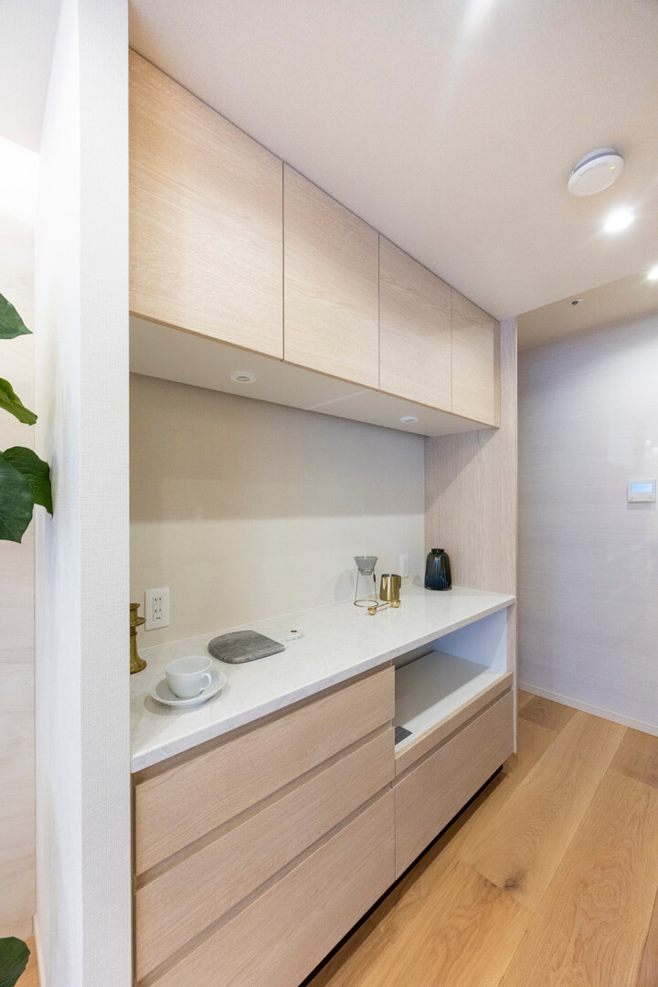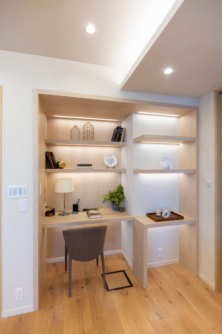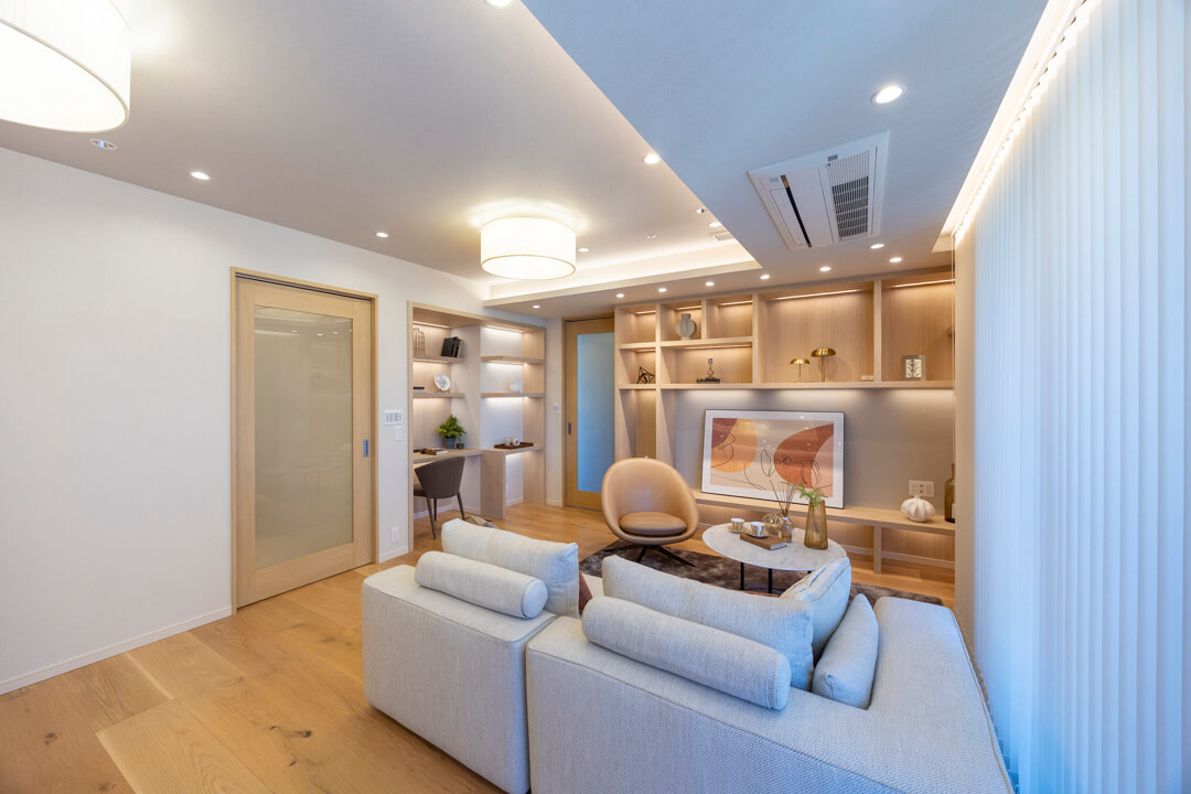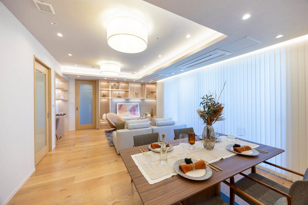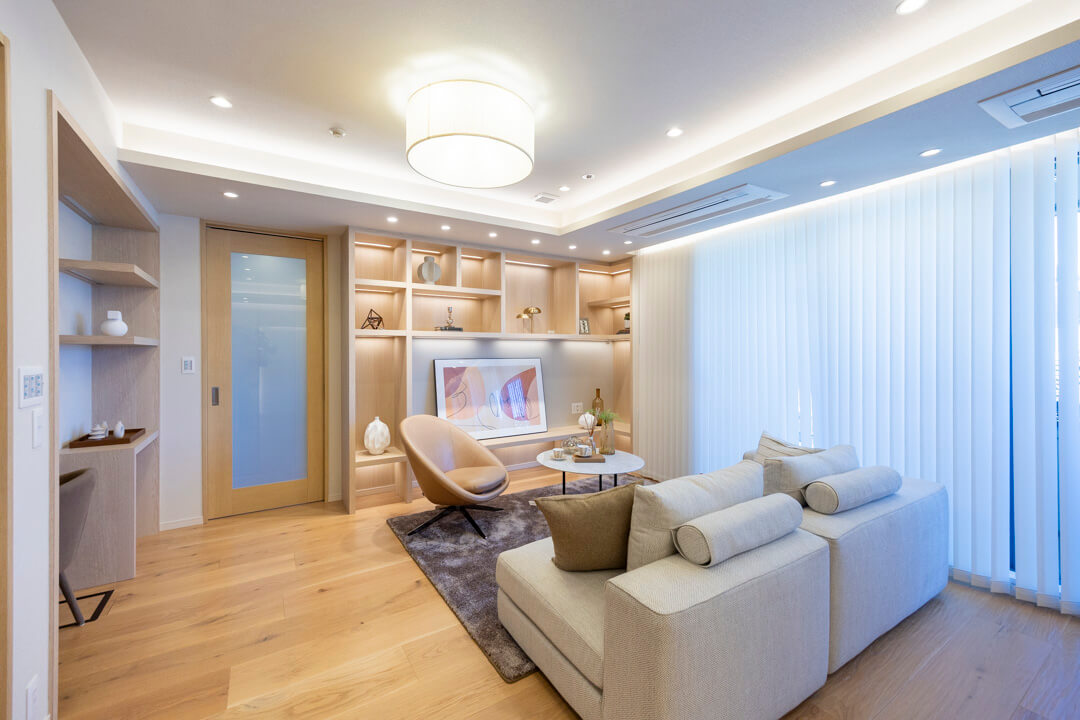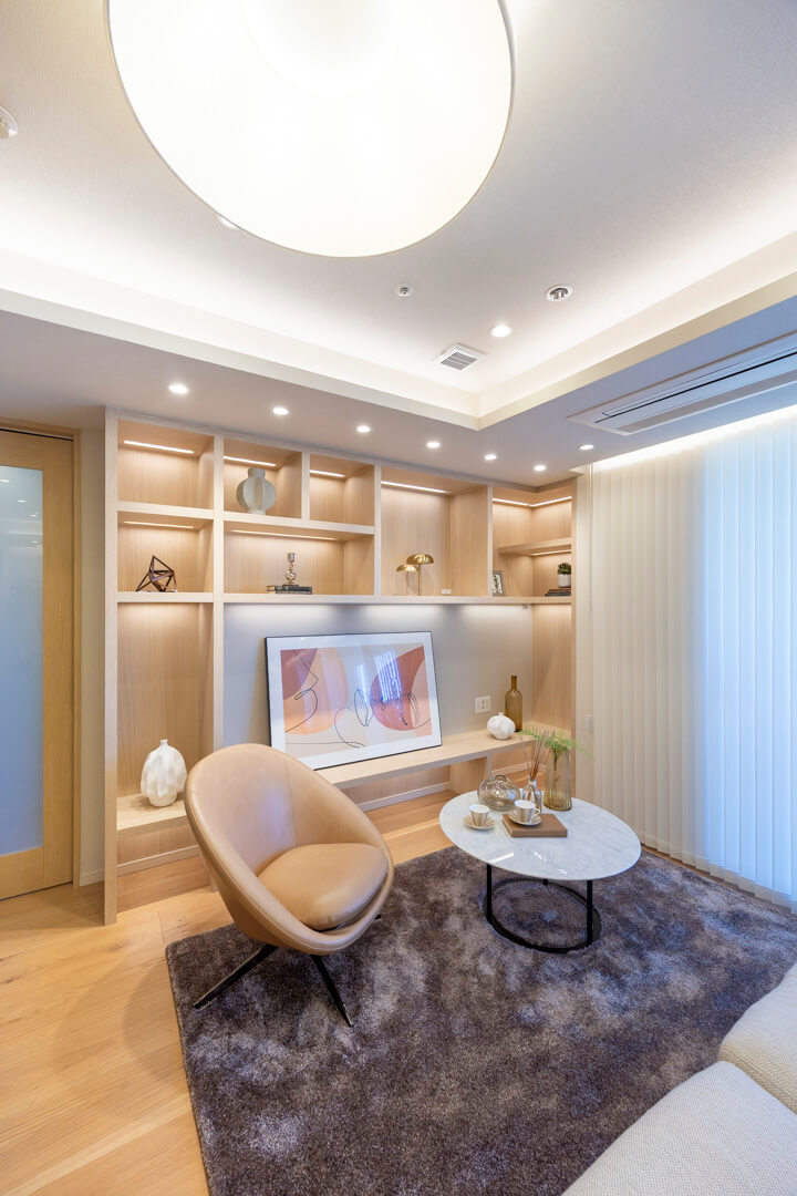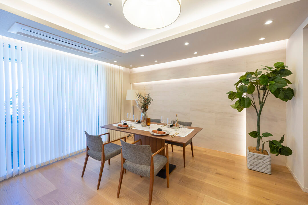 ゆとりある広さのリビングダイニング。天井高は最大約2600㎜あり、さらに窓面積も広く開放感をたっぷりと感じられます。天井や飾り棚には間接照明が施されており、より演出性の高い空間に。ビルトインエアコンも2台完備されています。また、リビングの一角にはデスクスペースも備わっており、デスクワークやちょっとした作業スペースにも便利です。