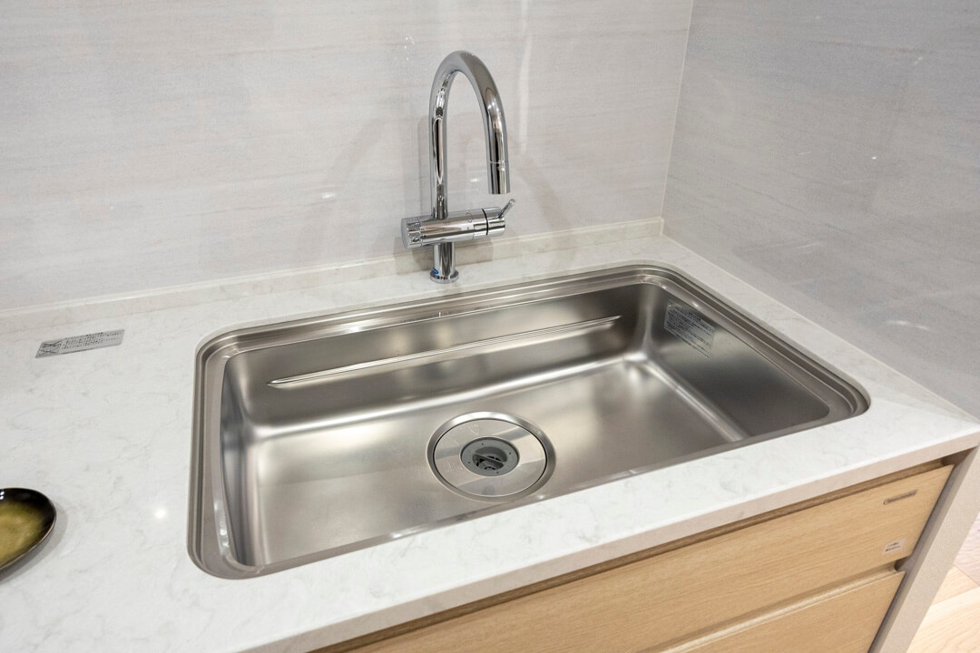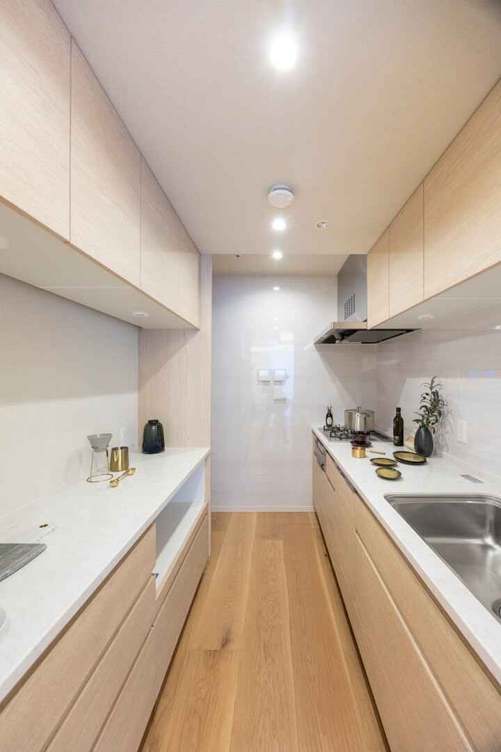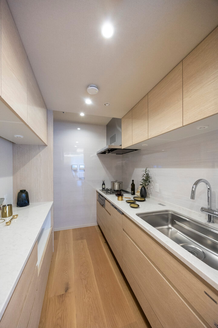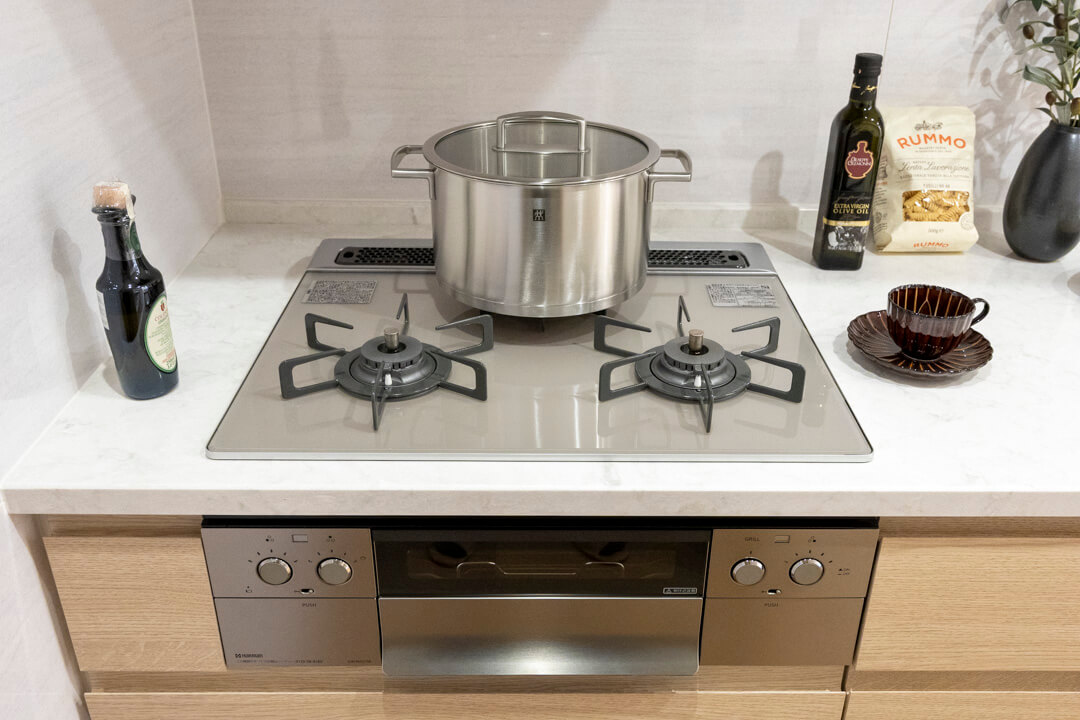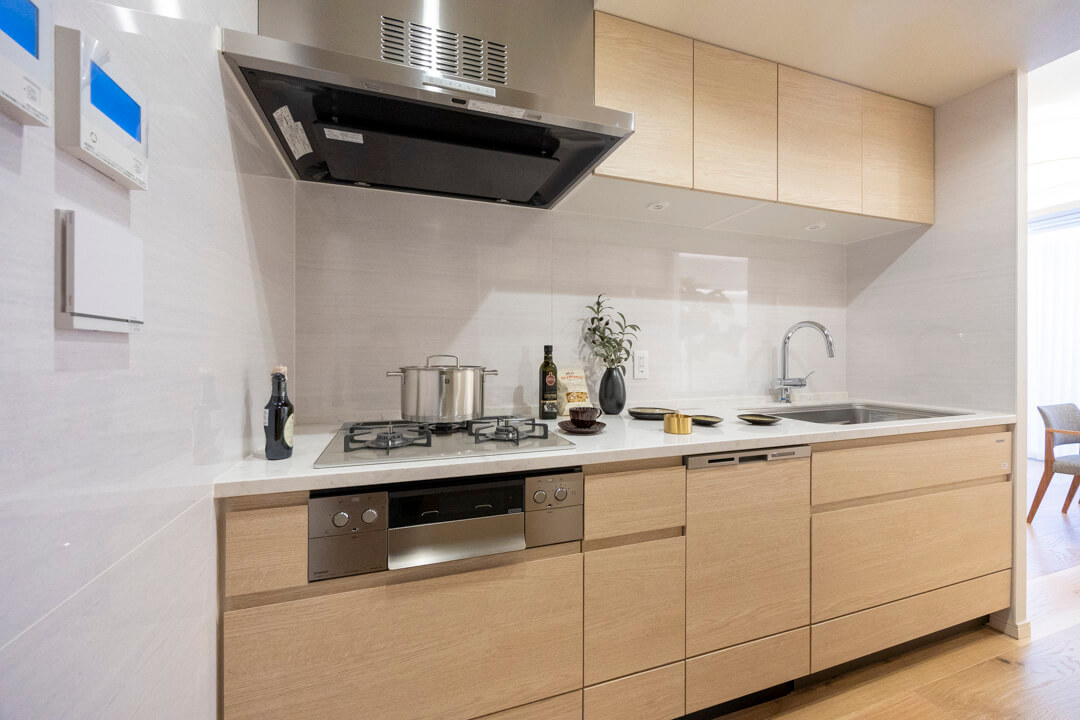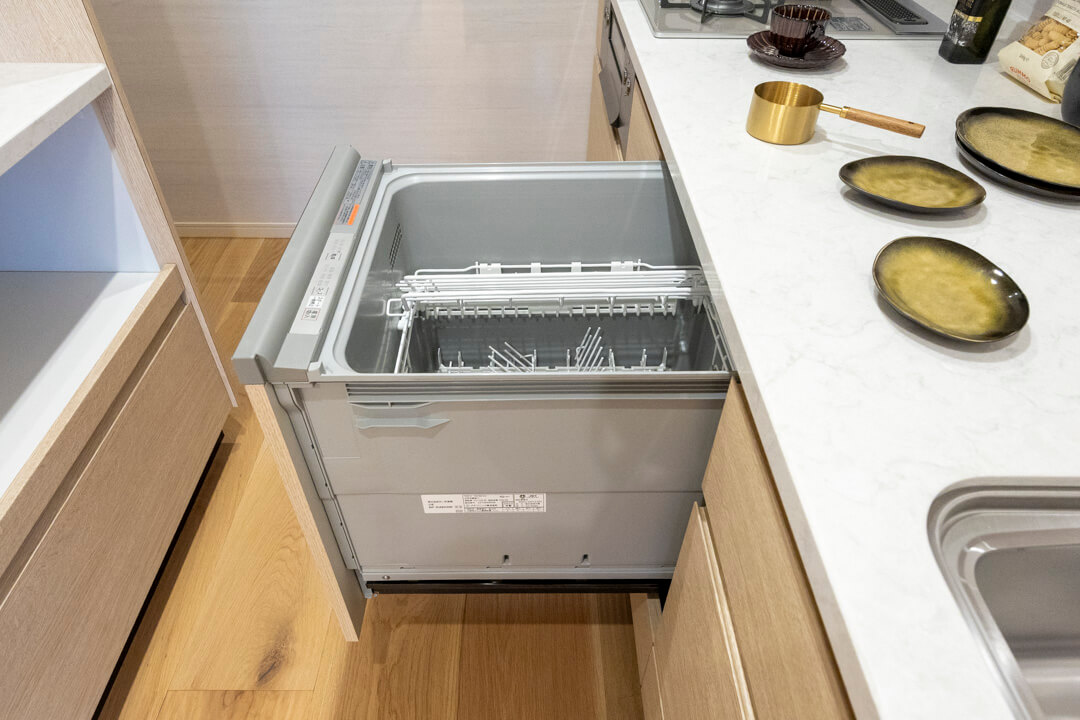 リビングダイニングとゆるやかに空間分けされたキッチンスペース。料理が捗る3口ガスコンロ、家事の時短に心強い食洗機付きで設備も充実。モノの出し入れがしやすい引き出し式のキャビネット付きで使い勝手の良さもポイントです。また、カップボードも完備されています。