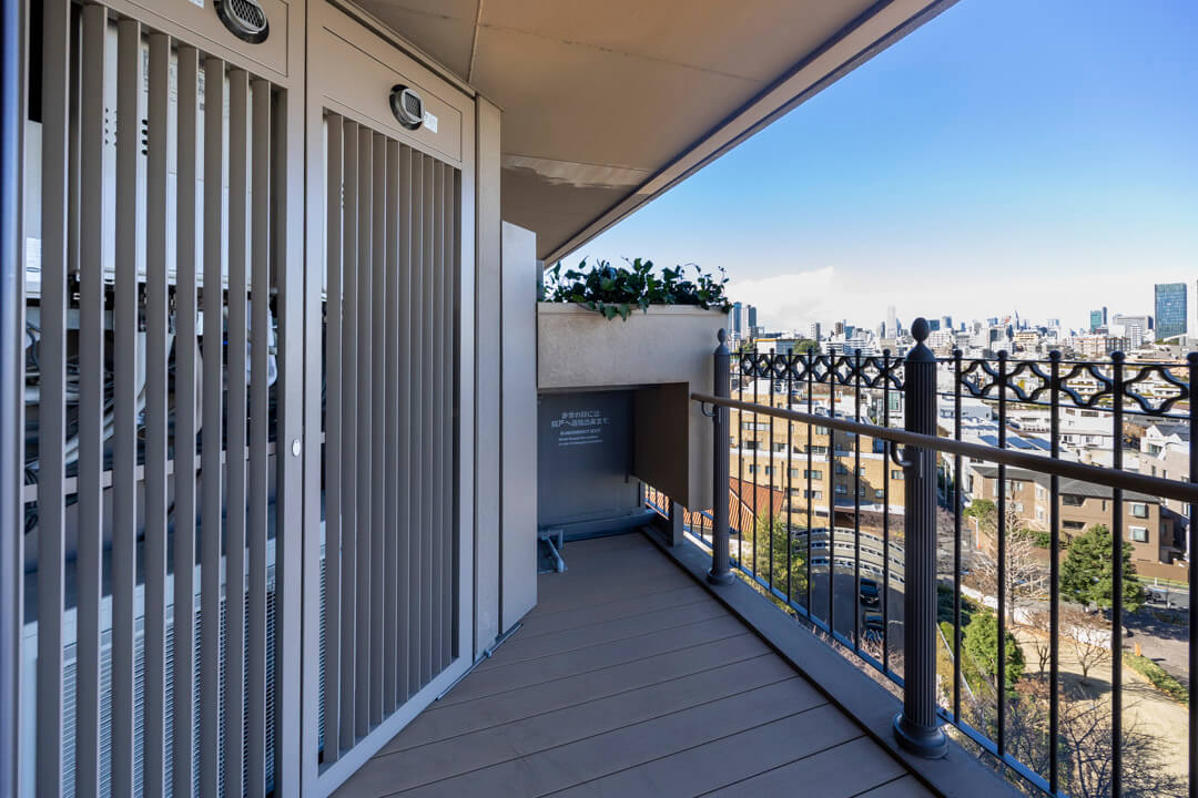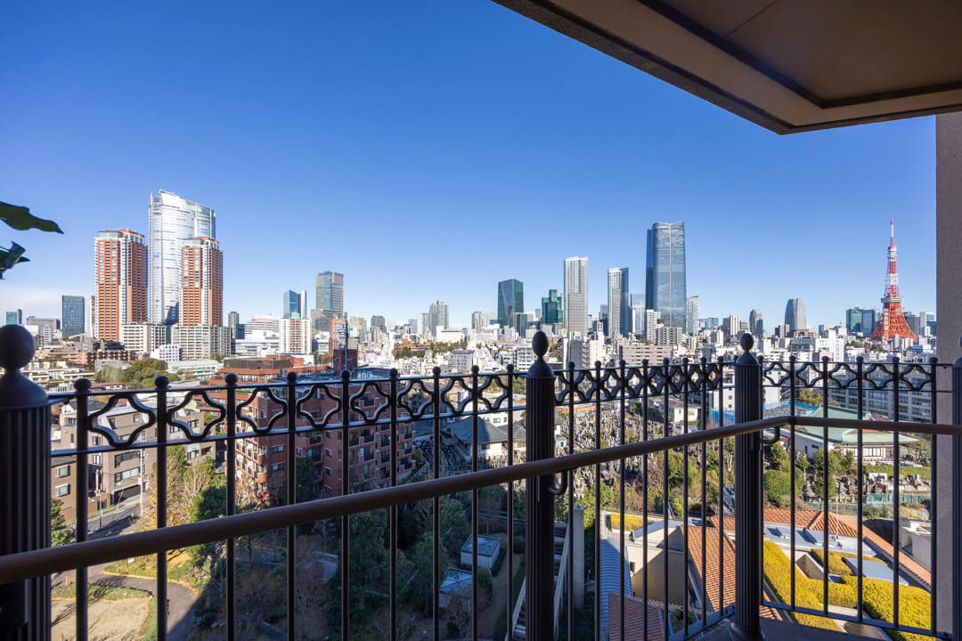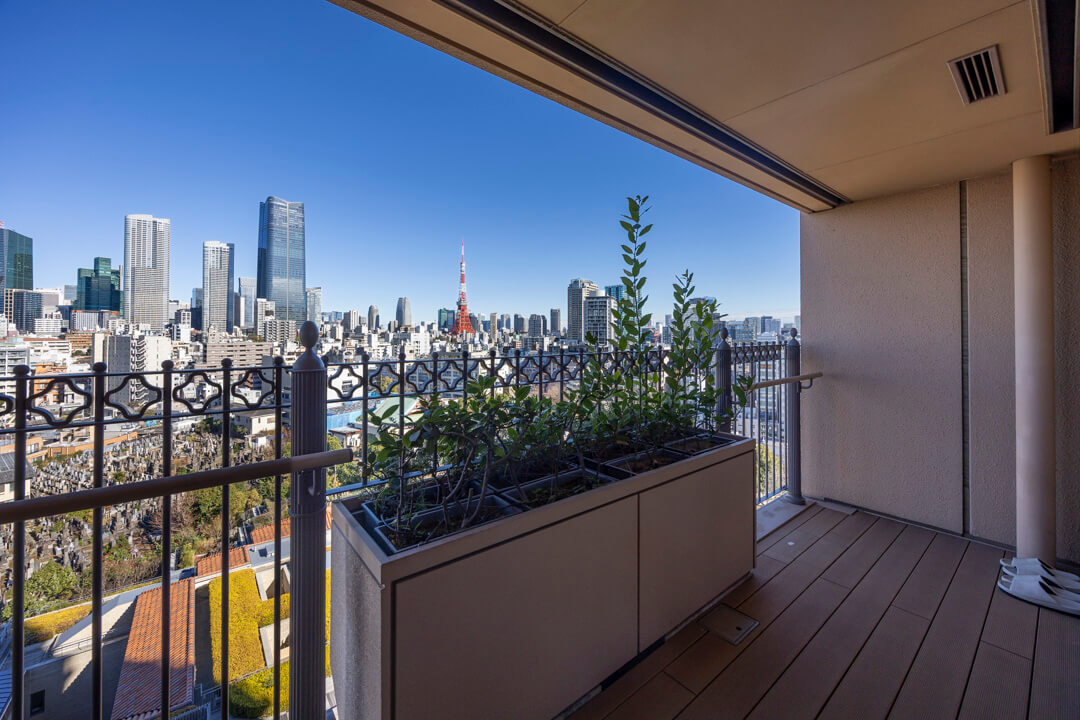 リビングダイニングに面した北東向きのバルコニー。ウッドデッキが敷かれており、花壇も付いているので緑も楽しめます。東京タワーも綺麗に望める贅沢な眺望。夜にはビル群と東京タワーの夜景が望めます。