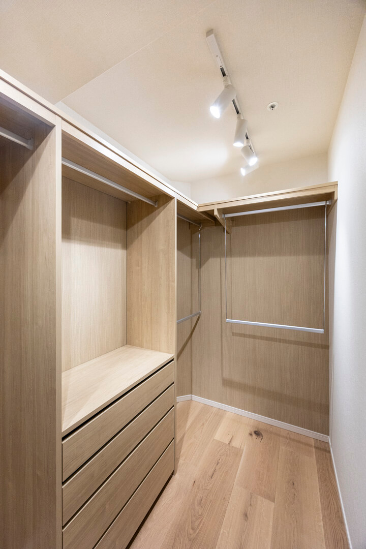 二面採光で開放感たっぷりな洋室1。バルコニーも付いています。ゆとりあるWIC(ウォークインクローゼット)には小物の収納に便利な引き出しも備わっています。