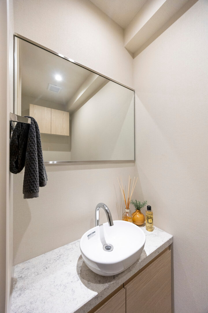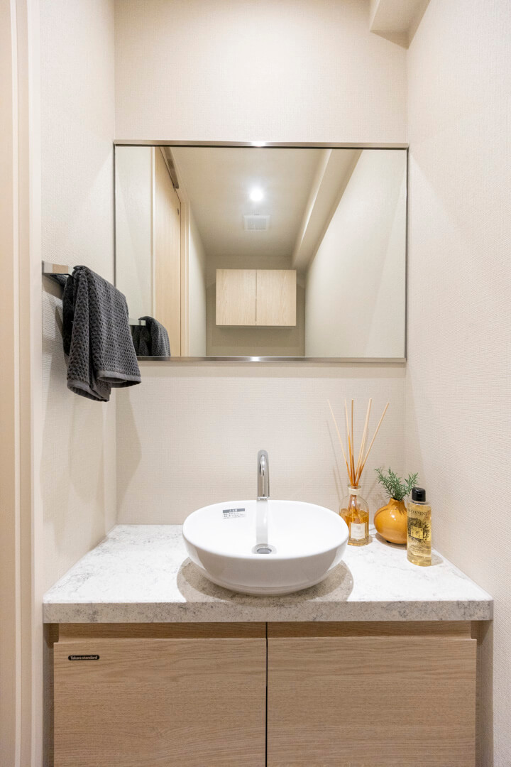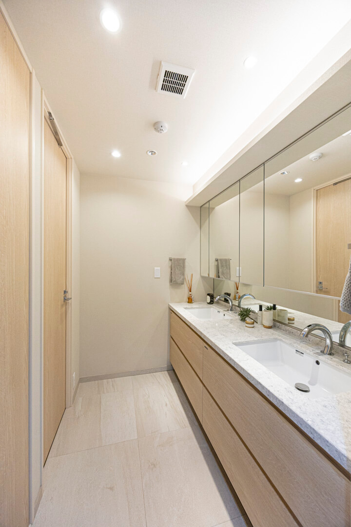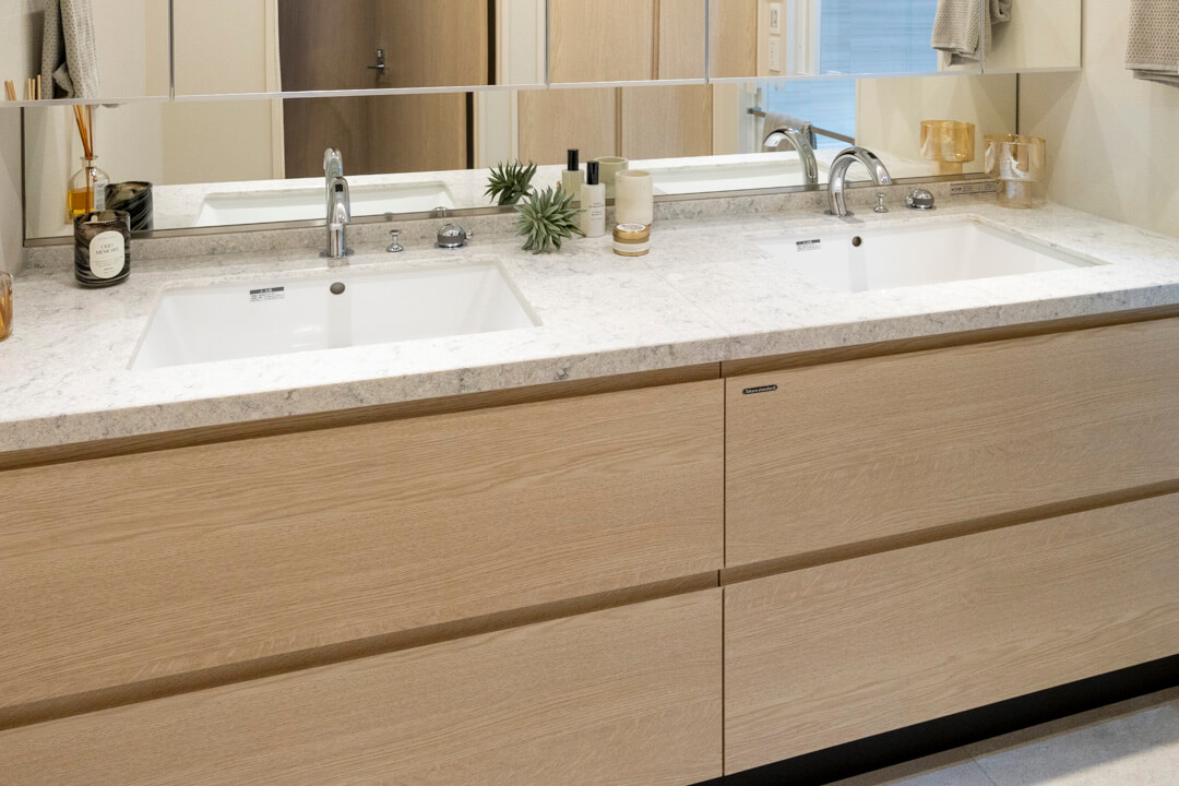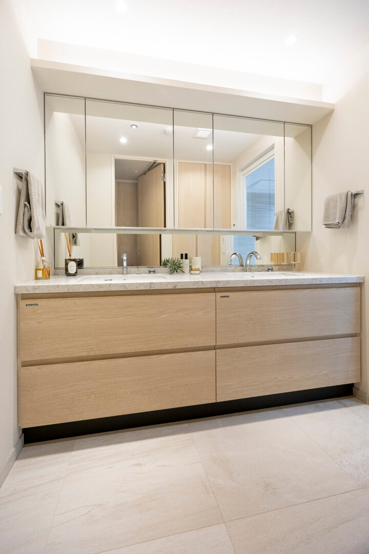 ホテルライクな2ボウル仕様の洗面化粧台。家族で使用時間が重なっても、それぞれゆっくり使えます。また、洗面まわりの小物がすっきりと整頓できるミラーボックスや、モノの出し入れがしやすい引き出し式のキャビネット付きで使い勝手の良さもポイントです。