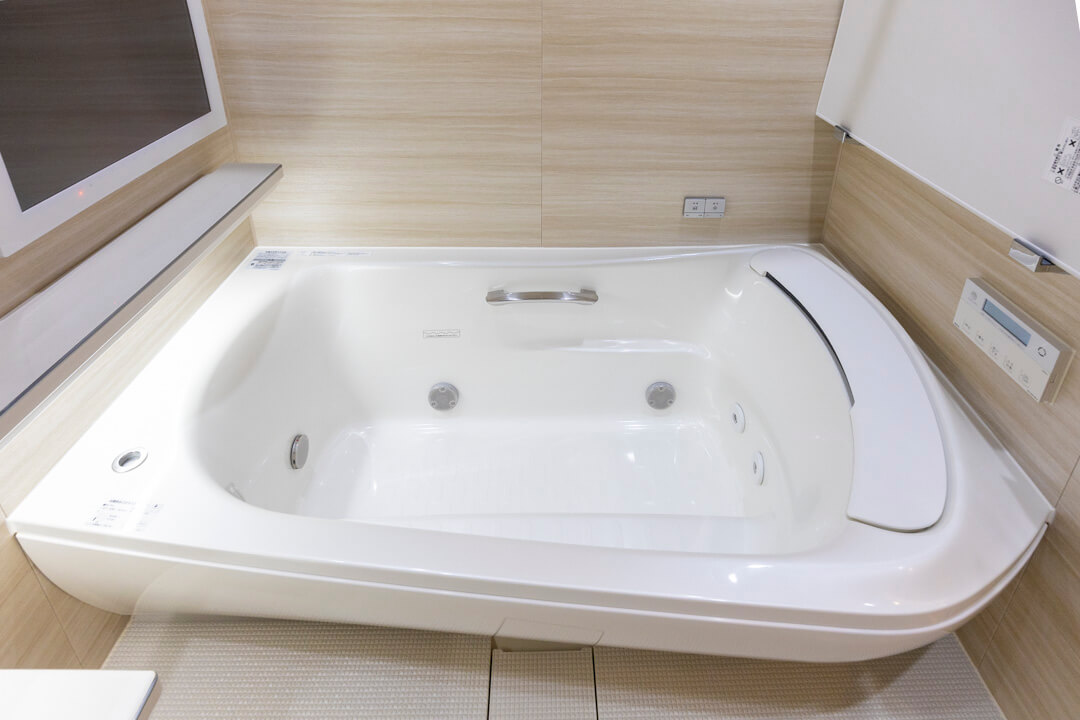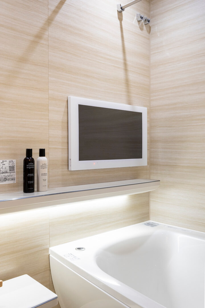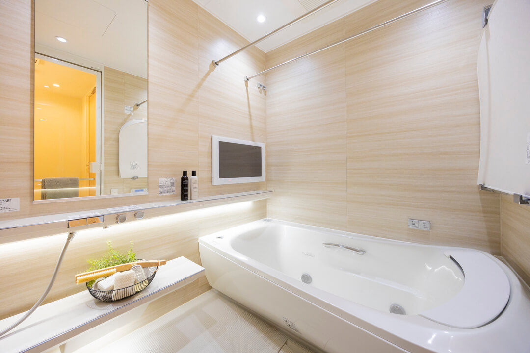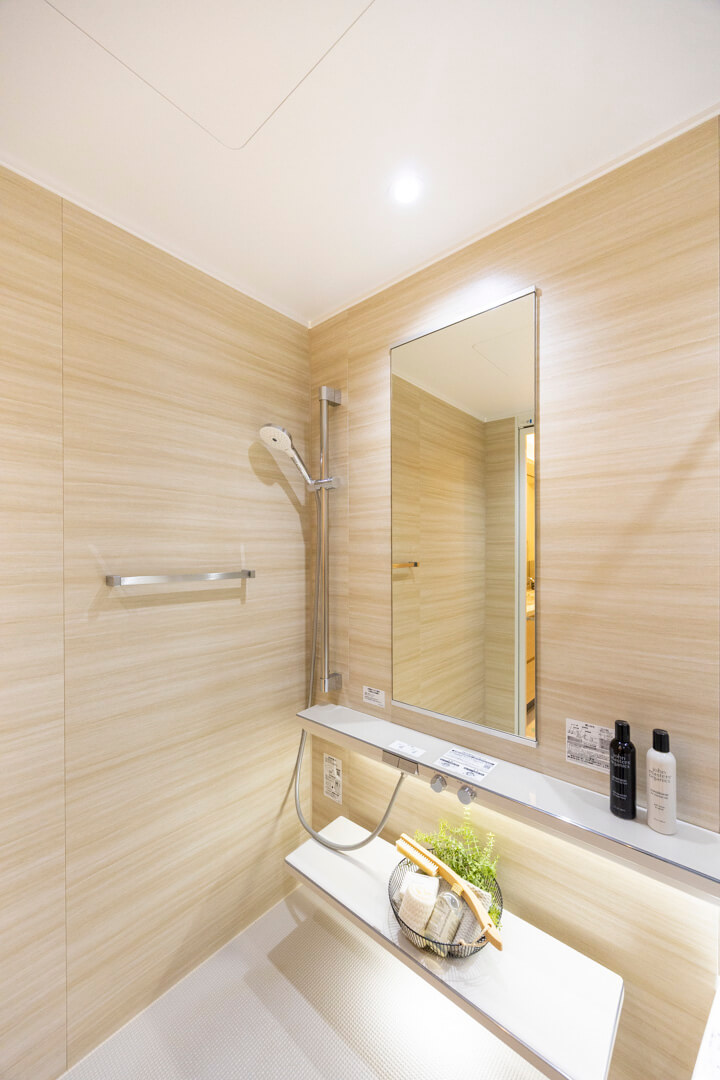 1620サイズのゆとりあるバスルーム。ウッド調であたたかみのある雰囲気です。浴室TV付きで至福のバスタイムをお楽しみ頂けます。浴室換気乾燥機+ランドリーパイプ付きで雨の日や冬場の洗濯にも困りません。浴槽には肩湯機能も備わっています。