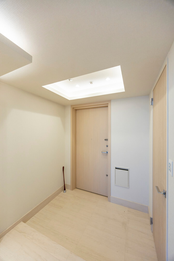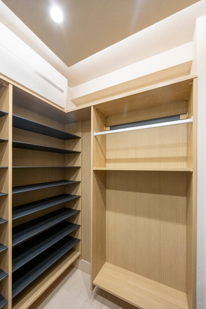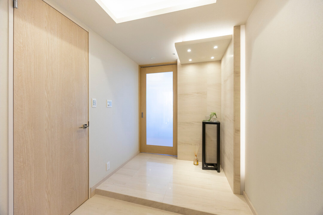 ゆとりある広さの玄関スペース。天然石調で上質な雰囲気が漂う落ち着きのある空間です。SIC(シューズインクローゼット)付きで靴をたっぷりと収納可能。ベビーカーやスポーツ用品などの収納もできる広さです。