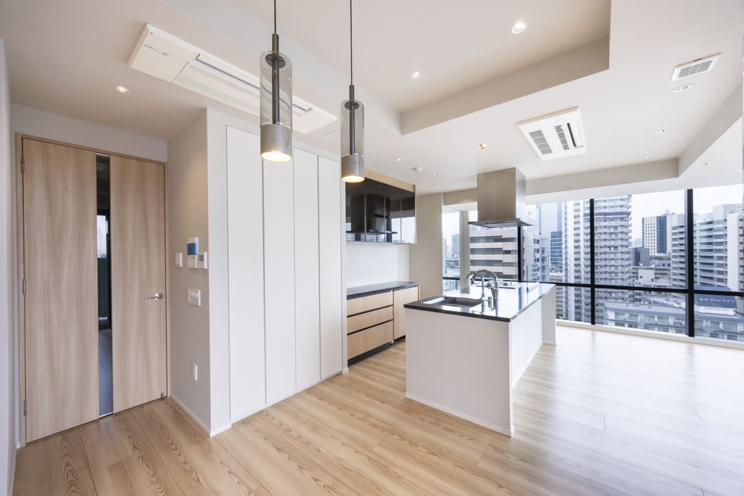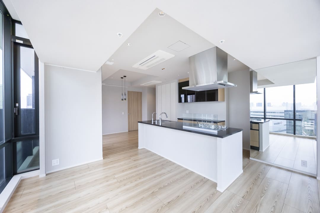 約17.8帖の広々としたリビングダイニングキッチンです。角部屋のため窓に囲まれており、開放感たっぷり。東京湾の水の潤いを感じます。また、ペットが飼育可(細則有)なので、大切なペットと一緒に暮すことができますよ。