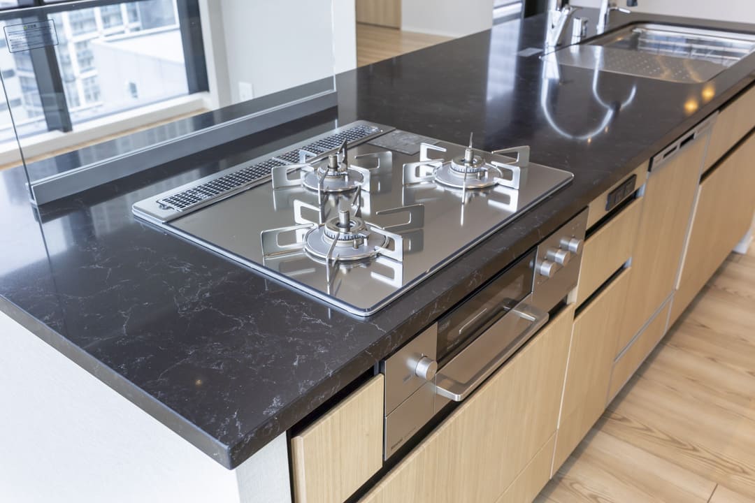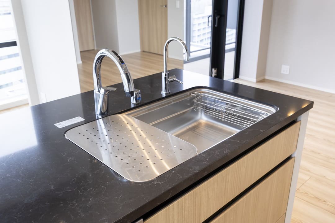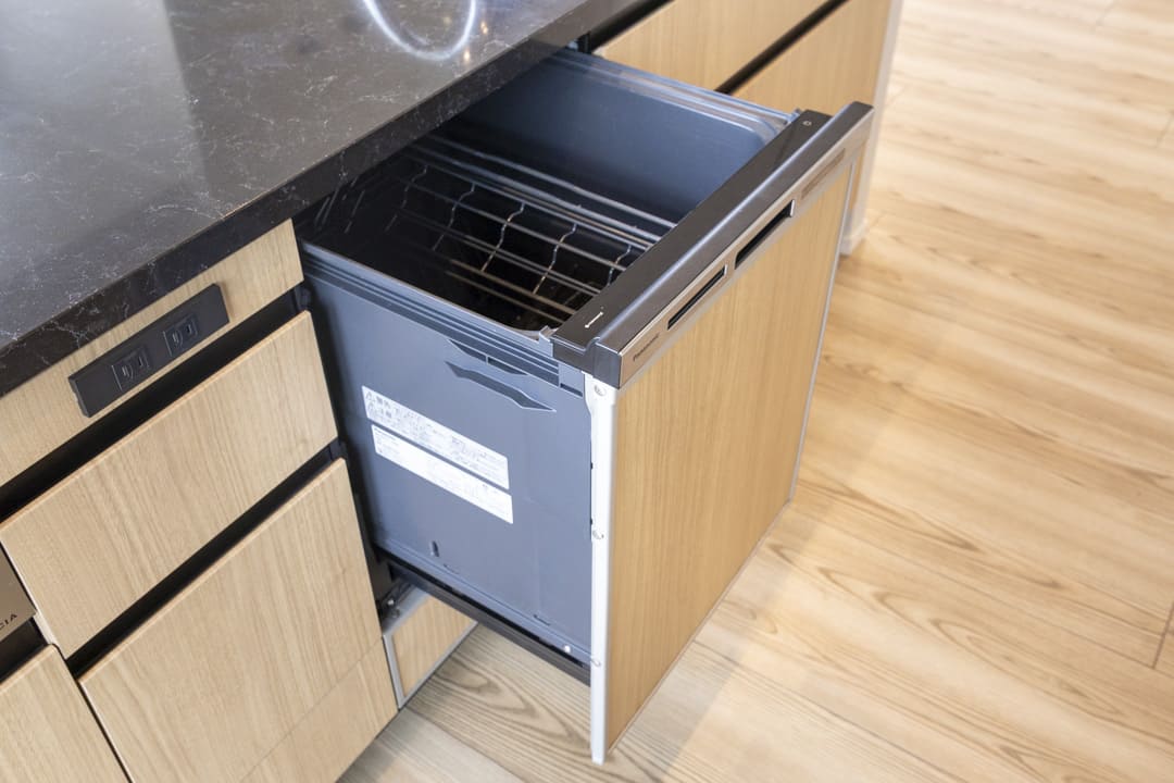 リビングを見渡しながら料理が楽しめるアイランドキッチン。ゲストを招いた際でもおしゃべりをしながらキッチンに立てます。いつでも家族の顔が見れて、自然と会話が弾む、そんな時間が過ごせそうですね。さらに、両側から出入りすることができる動線になっているので使い勝手も良好です。3口コンロ、グリル、食洗機付きと設備面も充実しています。