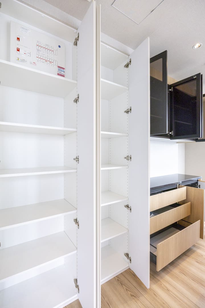 キッチンの背面側にはカップボードと棚が備え付けられています。調味料や食器などを収納できるだけでなく、電子レンジなどを置くこともできるので便利です。