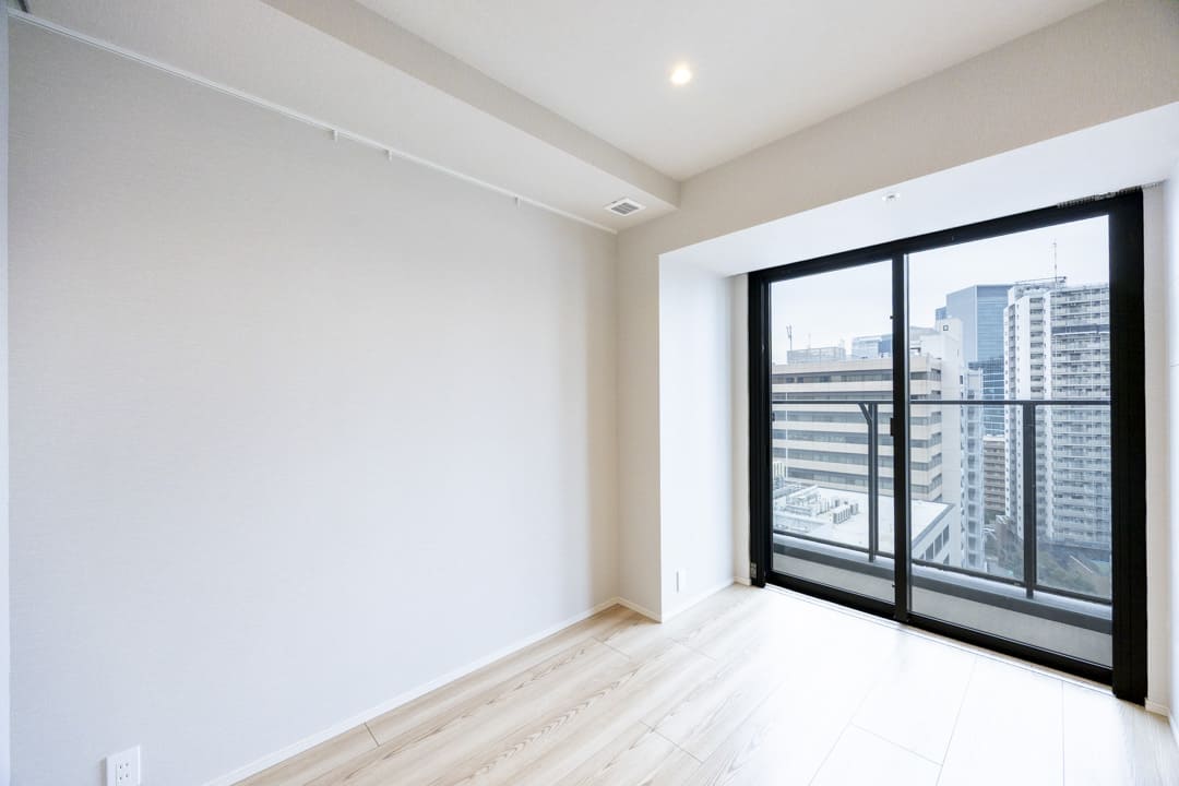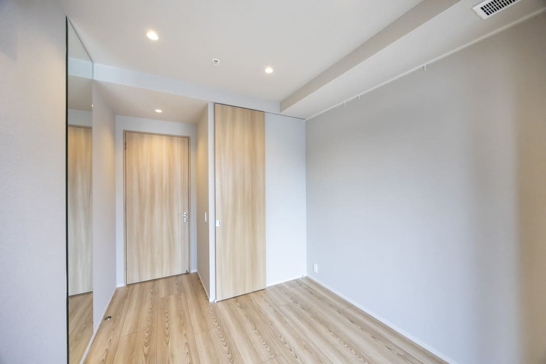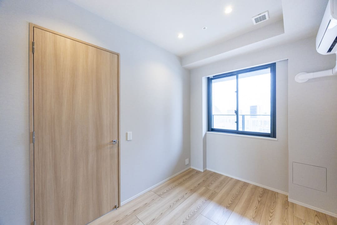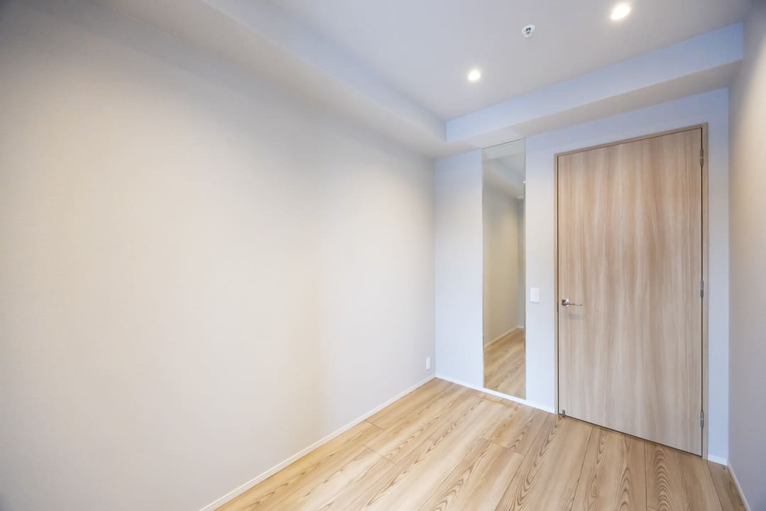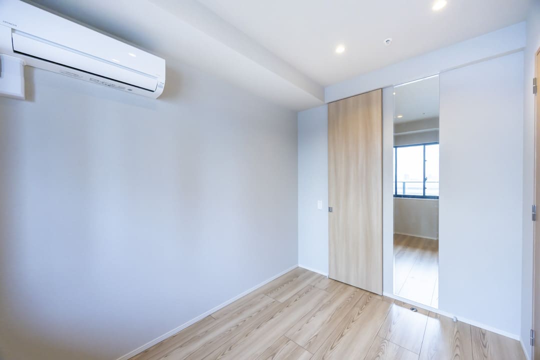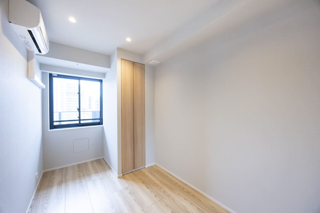 約5.3帖の寝室2は、独立性があって子ども部屋にぴったりな空間。窓やクローゼット、エアコンもあるので、過ごしやすそうです。壁面には鏡も設置されています。