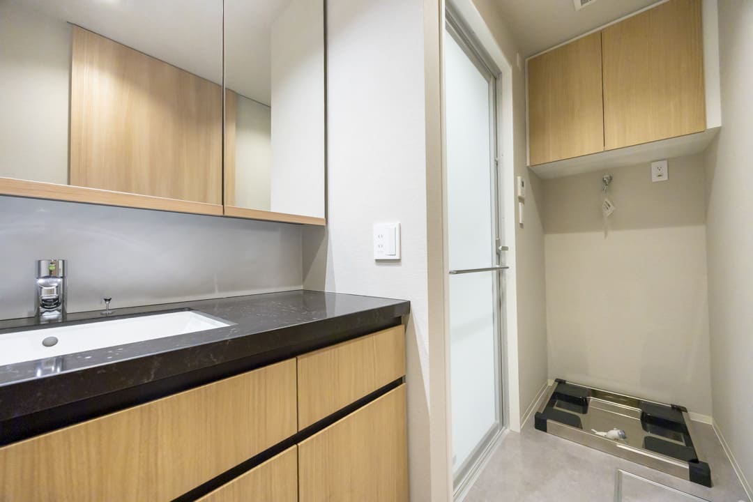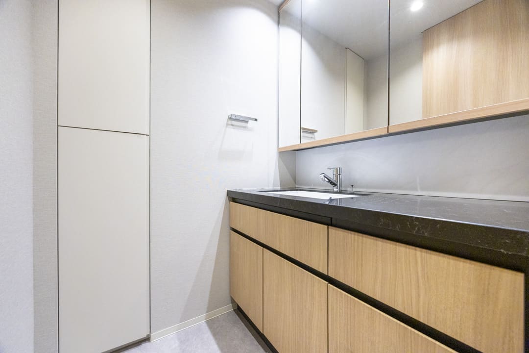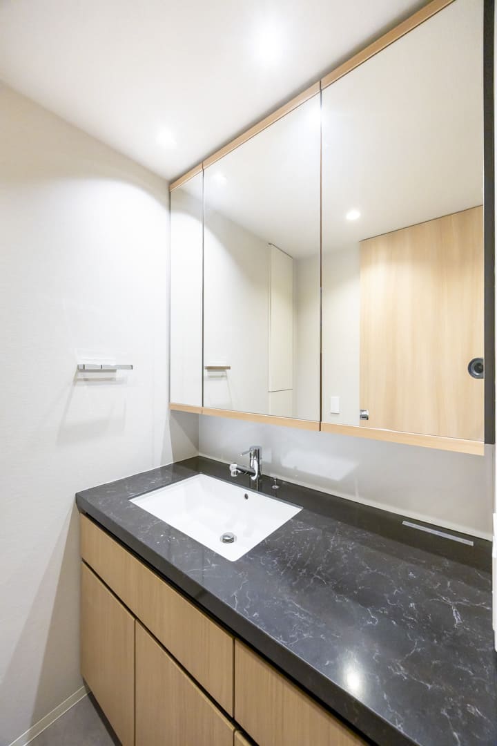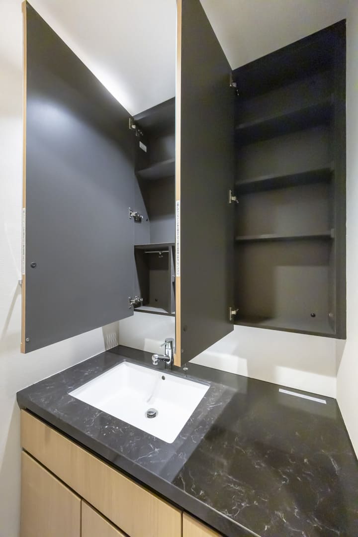 ブラックのカウンターは重厚感があり、サイドにスペースがあるので使い勝手良好。大きな三面鏡の中には化粧品などを収納できて便利な洗面化粧台です。また、入口には棚が造られているので、リネン類も収納することができます。