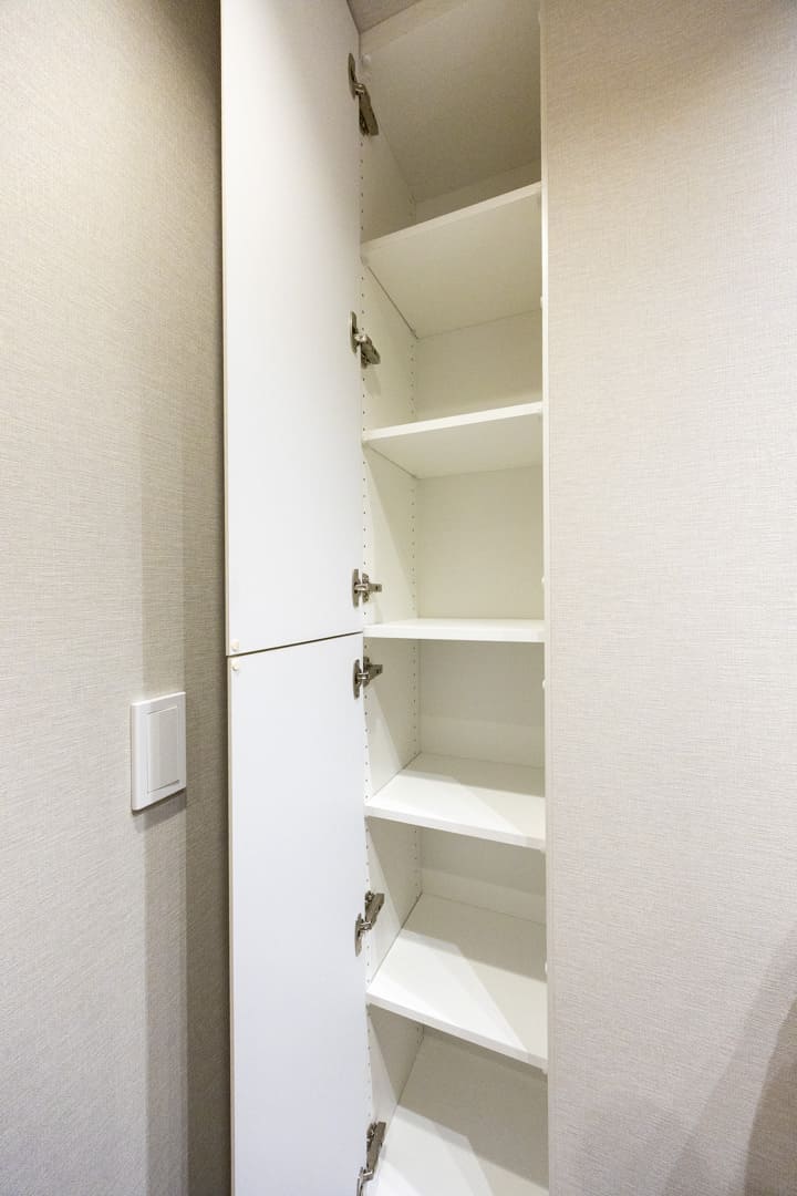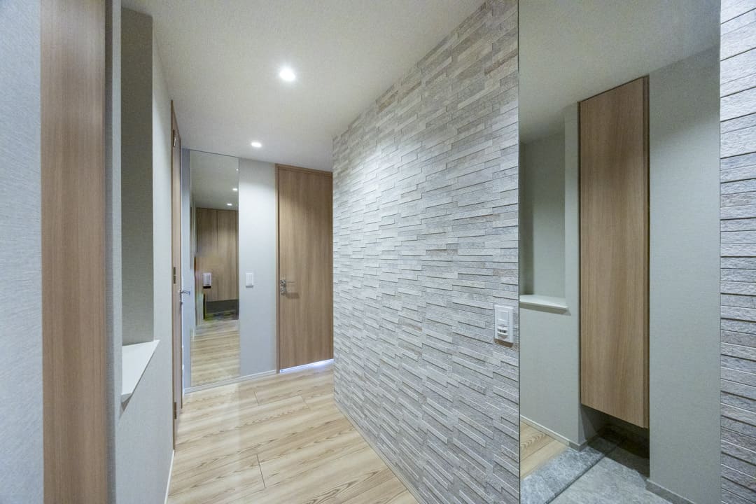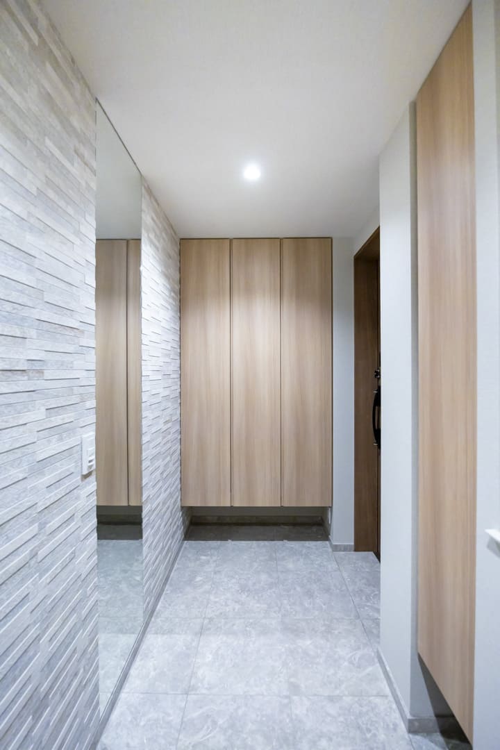 高級感が漂う玄関です。壁面にはアクセントクロス・鏡が設置されています。鏡があると、出掛ける際に全身のコーディネートをチェックできるので嬉しいですね。また、シューズボックスは高さがありますが、フロートタイプのため空間に圧迫感を与えません。傘立てスペースもあって◎。また、玄関外には住戸専用の宅配ボックスがあるので対面せずに荷物を受け取ることもできます。