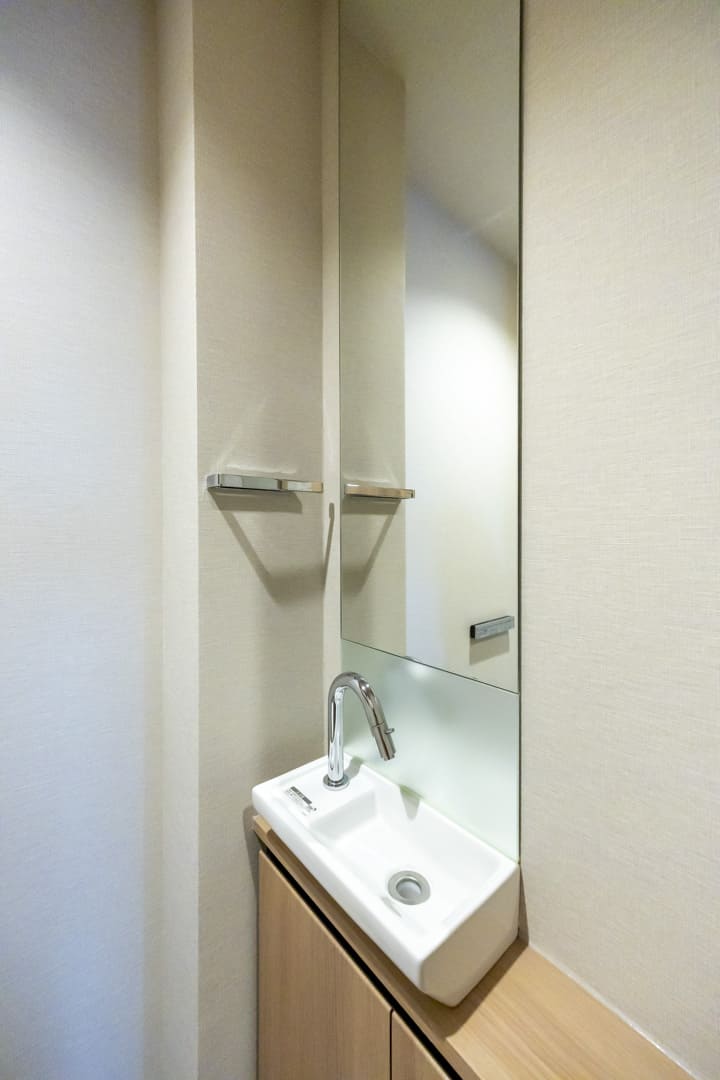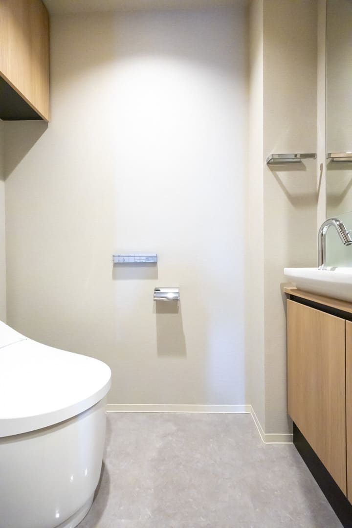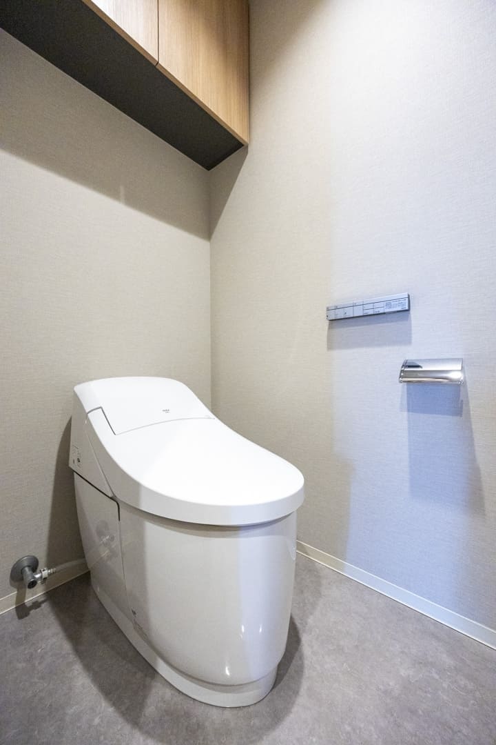 ウォシュレット一体型のトイレです。タンクレスタイプなのですっきりとした印象に。また、別途で手洗い器が造られているので、すぐに手を洗うことができて衛生的です。上部には吊戸棚が設置されていて、収納スペースもありますよ。