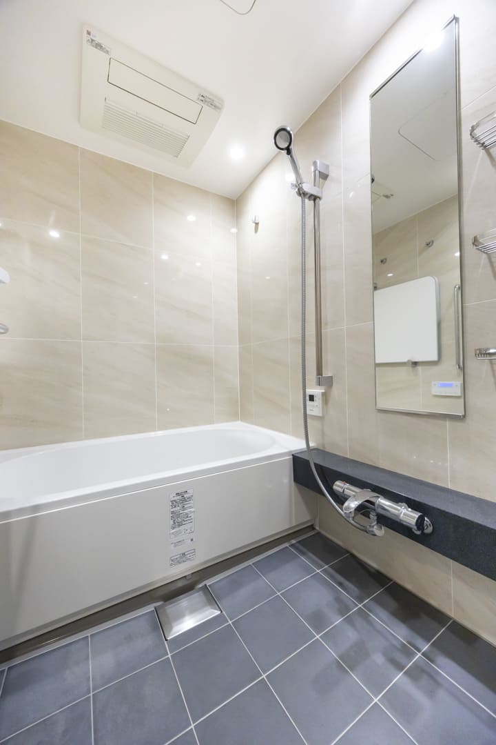 ベージュトーンで落ち着いた雰囲気のバスルームです。お風呂にゆっくり浸かるのが好きという方に嬉しい追い焚き機能を搭載。家族の入浴時間がずれてしまっても安心です。また、浴室乾燥機には暖房・乾燥・換気・ミストサウナの機能がついており、一年中快適に過ごすことができます。