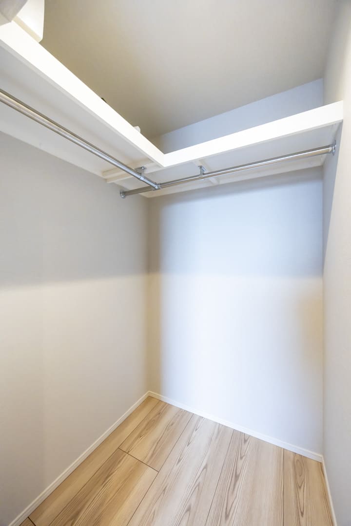 リビングダイニングキッチンと隣接している約5.1帖の寝室3です。書斎や趣味部屋など色々な使い方ができそうですよ。また、このお部屋にもウォークインクローゼットが造られており、中にはL字にパイプハンガーが設置されています。たくさんの洋服が収納できて◎。