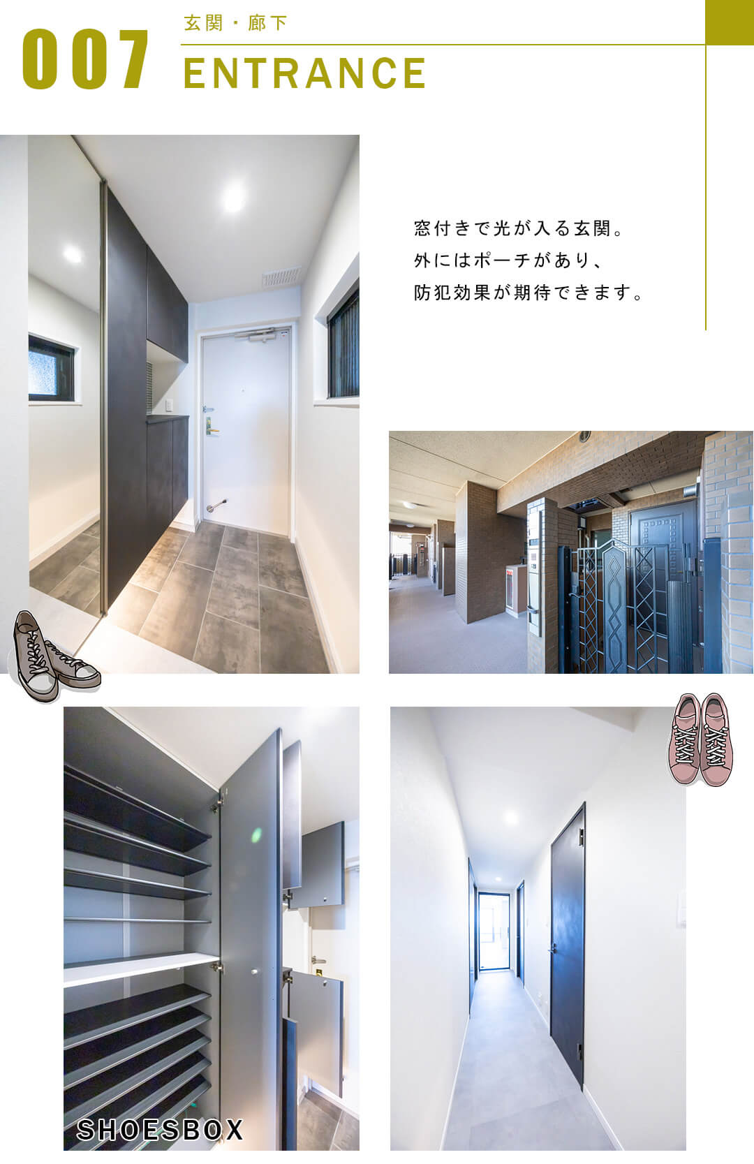 窓付きで光が入る玄関。入って右手には大容量のシューズボックスが設置されています。使い勝手の良い可動棚で、ロングブーツやレインシューズもすっきり収納できますよ。扉の一部が鏡張りになっていて、お出かけ前のコーディネートチェックができるのも嬉しいポイントです。玄関外にはポーチがあり、防犯効果が期待できます。