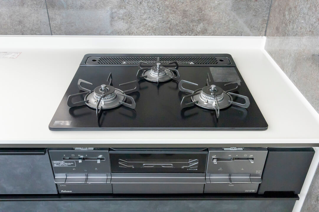 効率良く調理ができるグリル付3口ガスコンロを搭載。料理のレパートリーも増えそうです。さらに、食洗機が内蔵されているので、後片付けが捗り、節水効果も期待できます。水栓はセンサー式なので、手をかざすだけで水の止水・吐水をコントロールでき、手が汚れていても安心です。