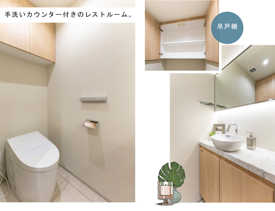 廊下に面していて独立性の高いレストルーム。TOTO製の温水洗浄機能付トイレに新規交換済みです。タンクレス仕様ですっきりとした見た目ですね。正面には手洗いカウンターがあり、すぐに手を洗うことができて衛生的。ゲストを洗面室まで案内する手間もかかりません。トイレットペーパーや掃除用品の収納に便利な吊戸棚も備え付けられています。