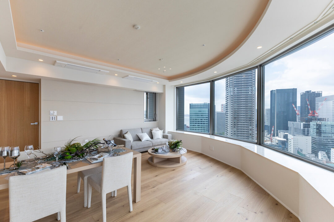 大開口の窓が並び、開放感溢れるリビングダイニング。カーブを描く間取りがやわらかな印象をもたらします。32階部分につき眺望良好◎。東京タワーを望む贅沢な眺めです。夜景も楽しみですね。折り上げ天井やビルトインエアコンが奥行きをもたらし、広々とした空間です。