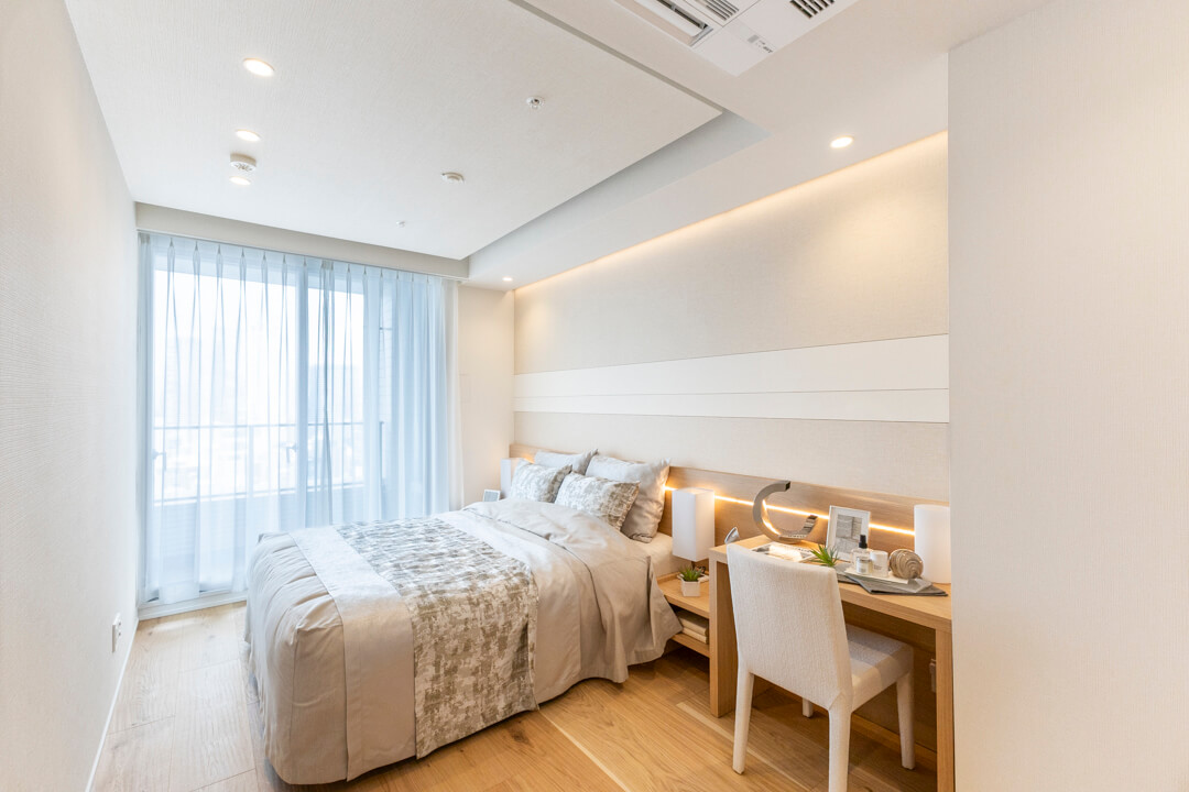 最も広い洋室1は主寝室にぴったり。LDK同様に床暖房が敷設されていて、寒い時期も快適に過ごせます。北西向きバルコニーに面していて開放感があり、ゆったり休めそう。間接照明のやわらかな明かりがリラックスタイムへ誘ってくれます。