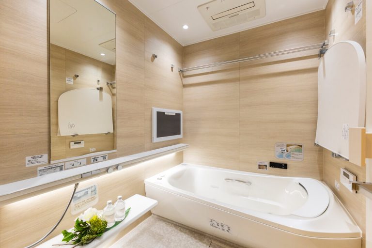 ゆとりある広さのバスルーム。木目柄パネルと間接照明が上質な空間を演出します。冷えやすい肩まわりに大流量のお湯が流れる「肩楽湯」&ランダムな曲線で円を描くように噴出された水流が腰を中心に心地よい刺激を与える「腰楽湯」が、疲れた身体を癒してくれます。TVモニターやヘッドレストも付いていて、ゆったりとしたバスタイムを過ごせますよ。人間工学を応用し、圧力を分散した形状のファーストクラス浴槽が採用されているのもポイントです。さらに、自動的に浴槽洗浄からお湯はり・保温までできる便利な機能を搭載◎。家事の手間が省けて嬉しいですね。