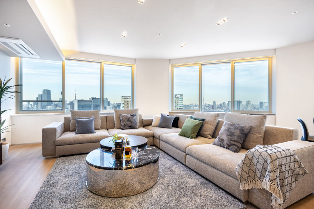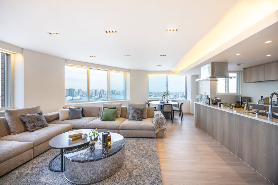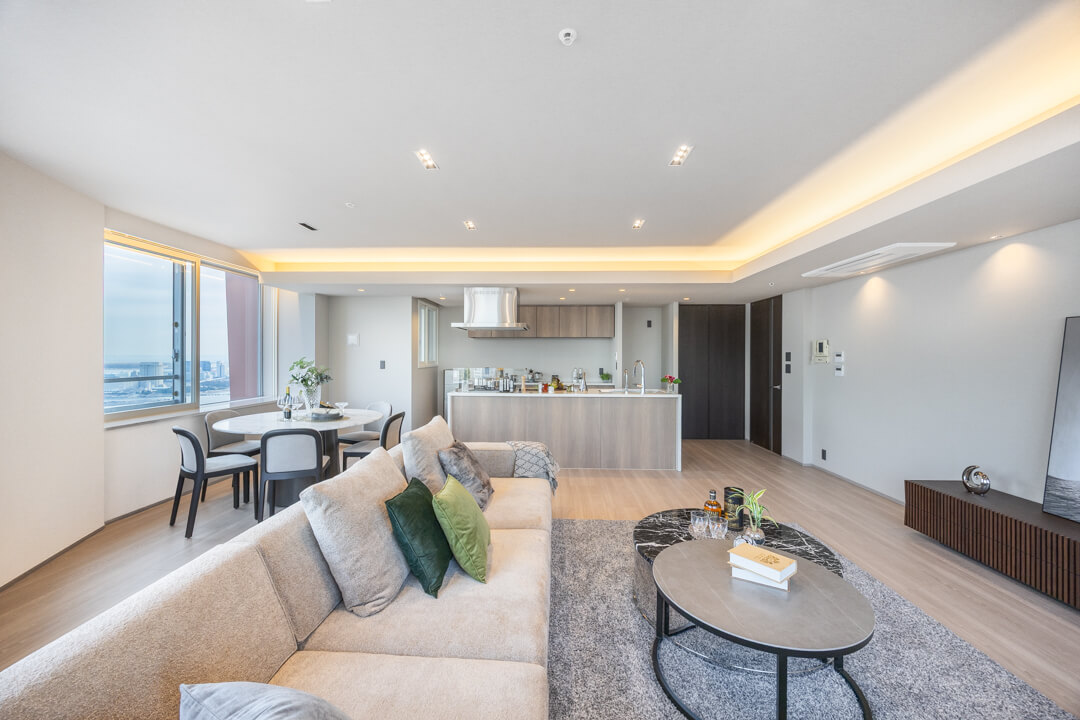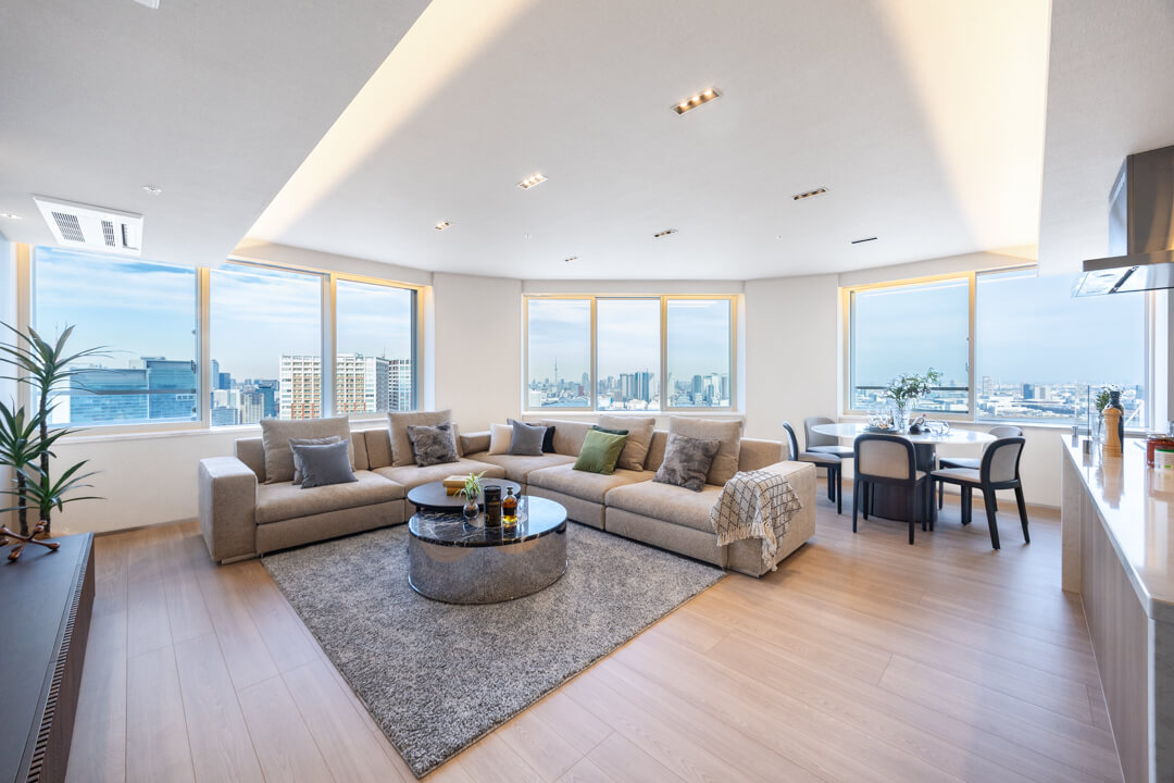 約31.9帖の広々としたリビングダイニングキッチンです。角部屋のため窓に囲まれており、開放感あふれる空間。東京スカイツリーとレインボーブリッジの両方を同時に視界に収められる特別な景色が堪能できます。北側からは東京タワーも望め、夜には都心の煌めきを充分に楽しめますよ。