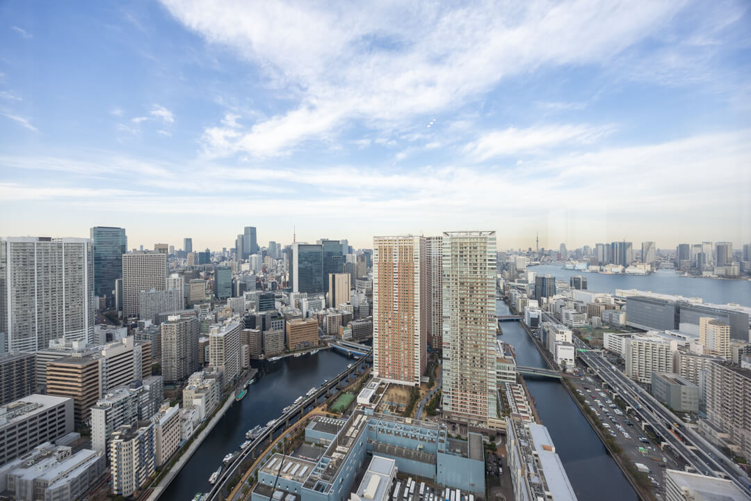 北側のバルコニーです。目の前には都会的かつ水の潤いを感じる眺望が広がっています。東京タワーや東京スカイツリーも望めて◎。
