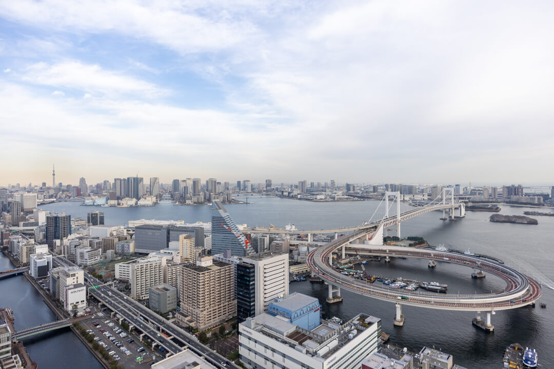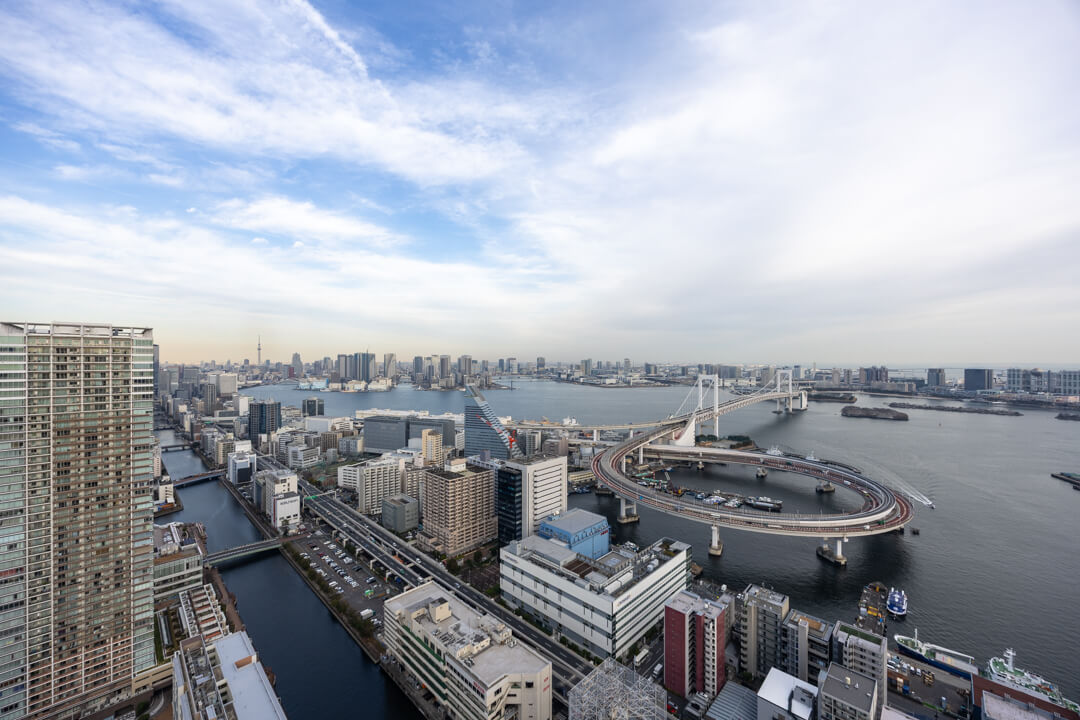 東側のバルコニーからは、レインボーブリッジや東京湾を望む贅沢な眺望が広がっています。空のグラデーションと橋のシルエットが美しい時間帯である夕暮れ時の景色も雰囲気が良くて◎。また、チェアなどを置いてほっと一息つける、癒しの空間にもなってくれそうです。
