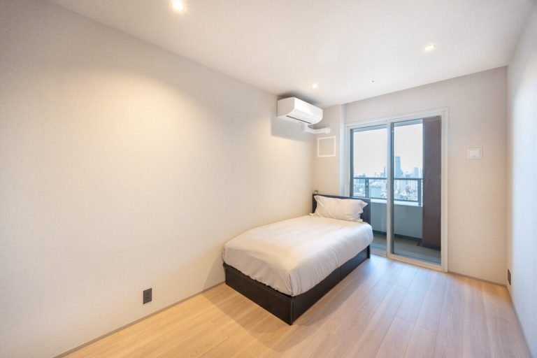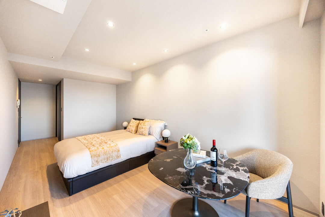 天井には間接照明があしらわれていて、お部屋を上品な雰囲気に演出してくれています。また、エアコンは埋め込み式のため、インテリアの邪魔になりません。さらに、入口付近には、生活感が出がちな小物を収納できる棚も造られています。