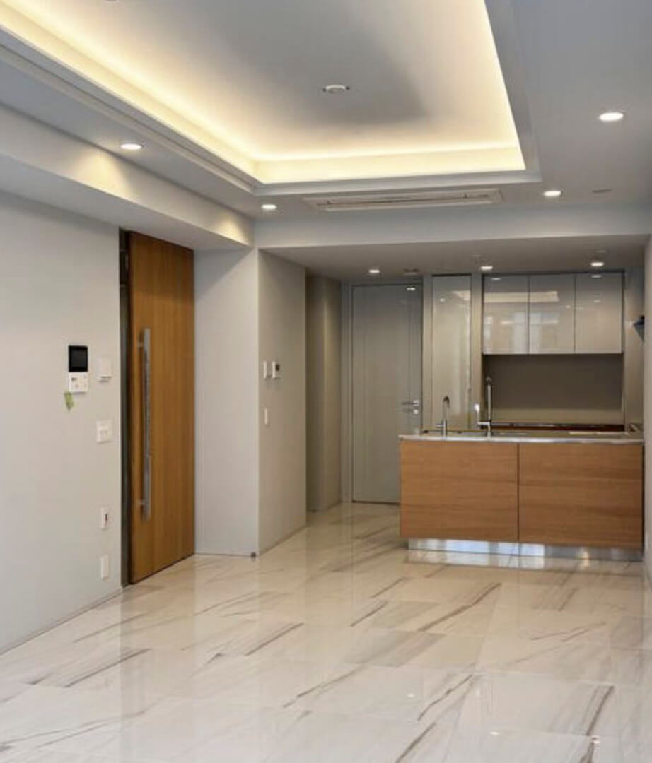 キッチンスペースを含め、約22.0帖のLDK。家族でゆったりと過ごせる広さです。床は天然石調のタイル貼りで高級感のある雰囲気。天井には間接照明が施されており、空間をやさしい光で包み込んでくれます。