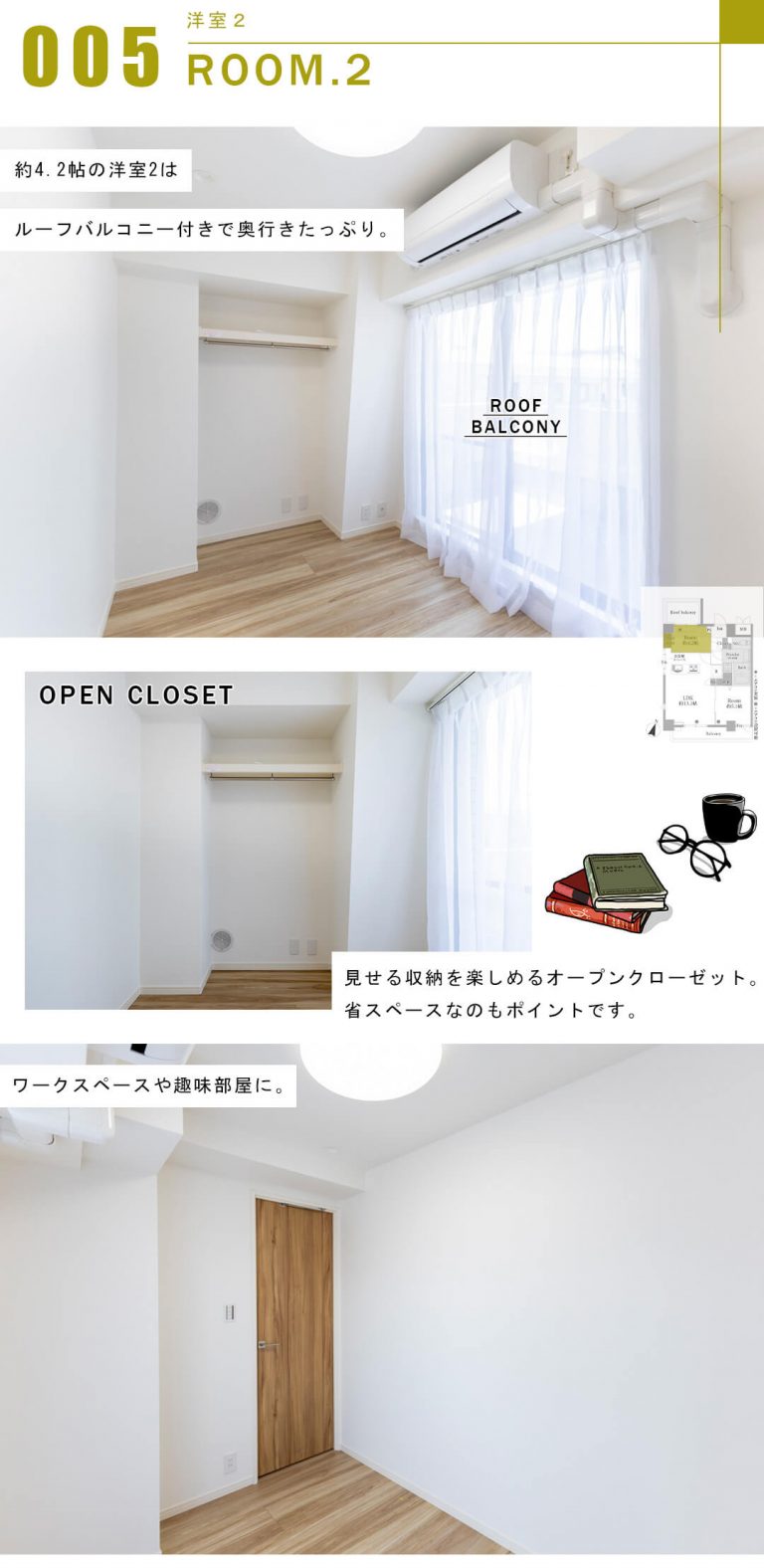 約4.2帖の洋室2。廊下に面していて独立性の高い空間です。作業に集中できそうなので、ワークスペースや趣味部屋にぴったりですね。ややコンパクトですが、ルーフバルコニー付きで奥行きたっぷり。省スペースなオープンクローゼットが採用されているのもポイントです。見せる収納を楽しんでください。