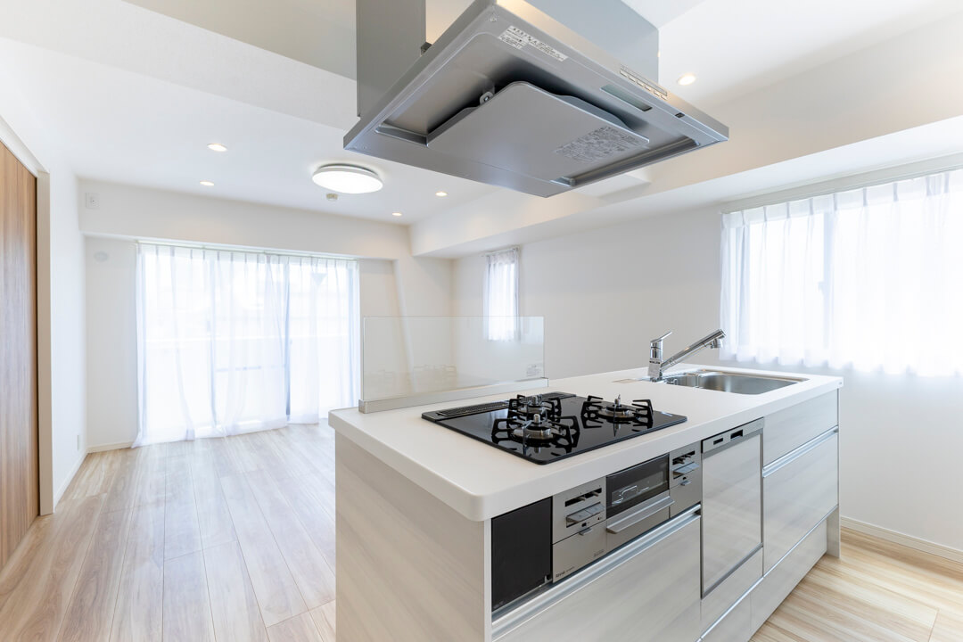 存在感のあるアイランドキッチン。左右から出入りでき、効率良く動くことができます。パートナーとの料理も快適に楽しめそうですね。窓に囲まれ開放的なのも嬉しいポイント。コンロ前にはガラスガードがあり、リビング側への油跳ねを防いでくれます。