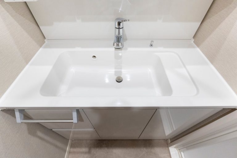 白基調で清潔感のある洗面化粧台。大きな三面鏡には縦型の照明が入っていて、身だしなみを整えるのに便利です。中は収納棚になっていて、洗面まわりの小物をすっきり収納できますよ。コンセント内蔵なので、電動歯ブラシやシェーバーを充電できるのも嬉しいポイントです。洗面ボウルとカウンターには継ぎ目や隙間がないので、汚れが溜まりづらくお手入れ簡単。タオルやパジャマの収納に便利な可動棚も設置されています。