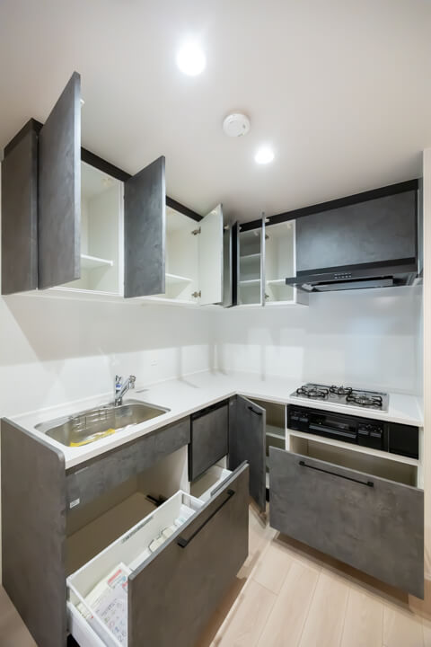 作業スペースが広々使えるL字型のシステムキッチン。料理が捗る3口ガスコンロ、家事の時短に心強い食洗機付きで設備も充実。モノの出し入れがしやすい引き出し式のキャビネット付きで、使い勝手の良さもポイントです。