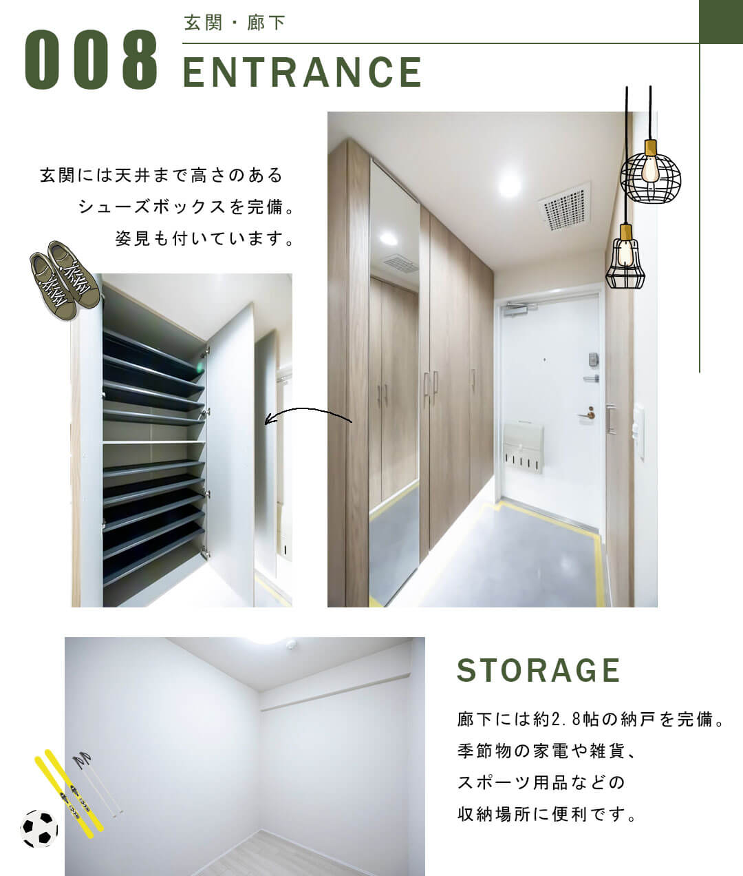 玄関には天井まで高さのあるシューズボックスを完備。靴がたっぷりと収納できます。また、姿見も備わっており、お出かけ前の身だしなみチェックもできます。また、廊下には約2.8帖の納戸も完備。季節物の洋服や家電、スポーツ用品などの収納にも便利です。