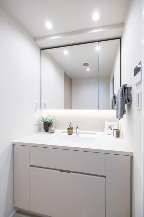 間接照明が美しい洗面化粧台。洗面まわりの小物がすっきり整頓できるミラーボックス付きで、いつでも整った状態をキープできそうですね。