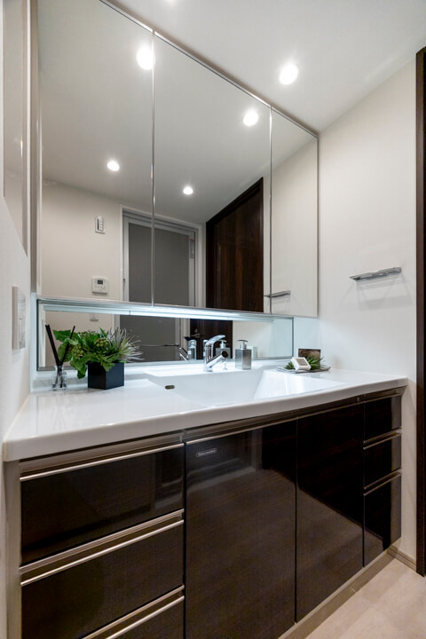 洗面化粧台は洗面まわりの小物がすっきり整頓できるミラーボックス付きでいつでも整った状態をキープできそうですね。洗面下のキャビネットリネン庫付きで収納スペースが充実しています。