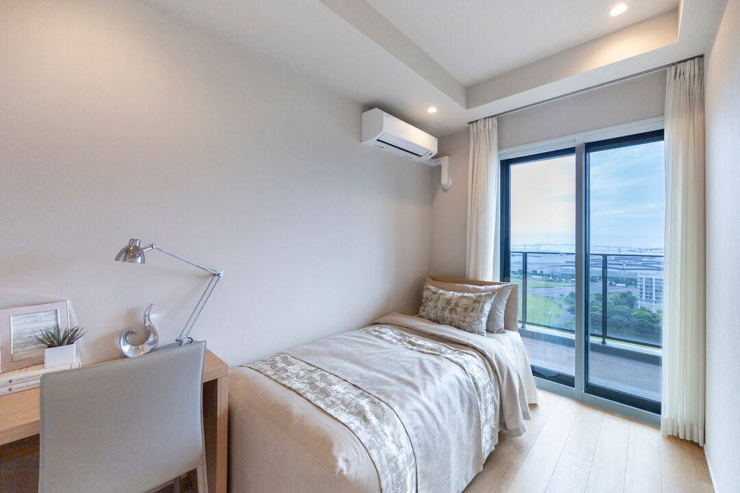 リビングダイニングから直接出入りできる洋室。窓はバルコニーに面していて開放的。クローゼット、エアコンも備わっています。寝室としてはもちろん、ワークスペースや趣味部屋としても使いやすいお部屋です。